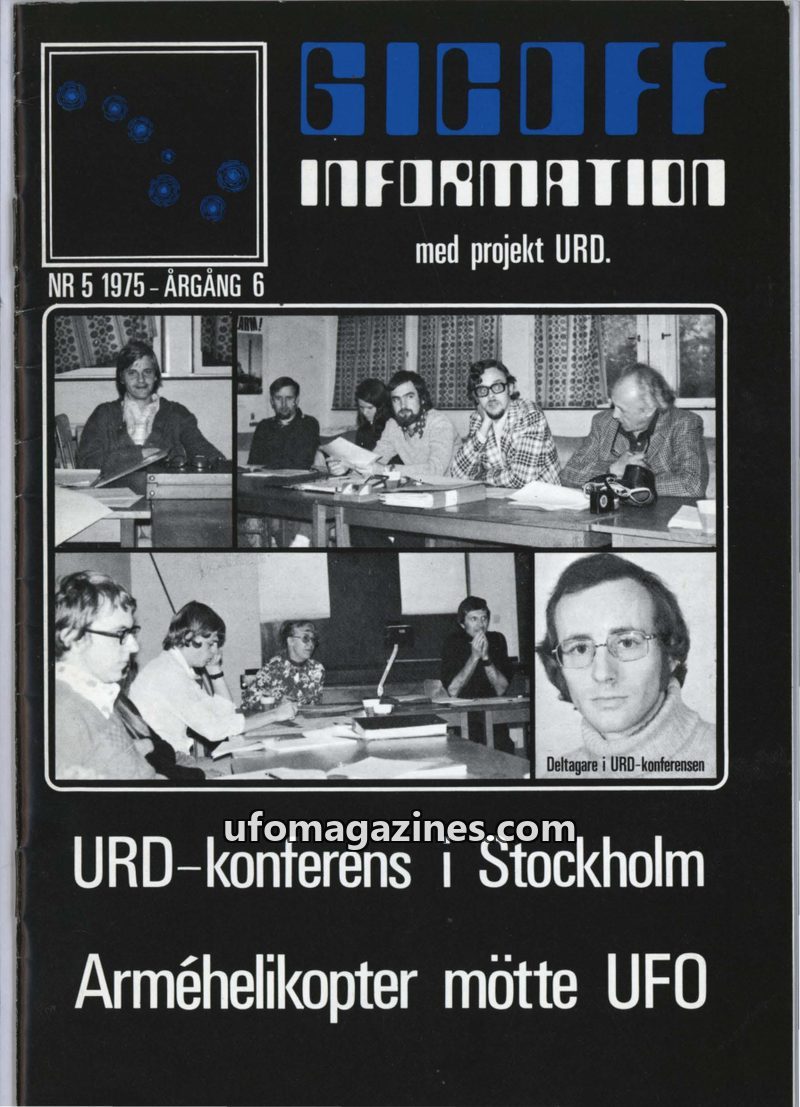 This issue of GIGOFF INFORMATION from 1975 focuses on UFO phenomena and the URD project. It details a URD conference in Stockholm where an army helicopter reportedly encountered a