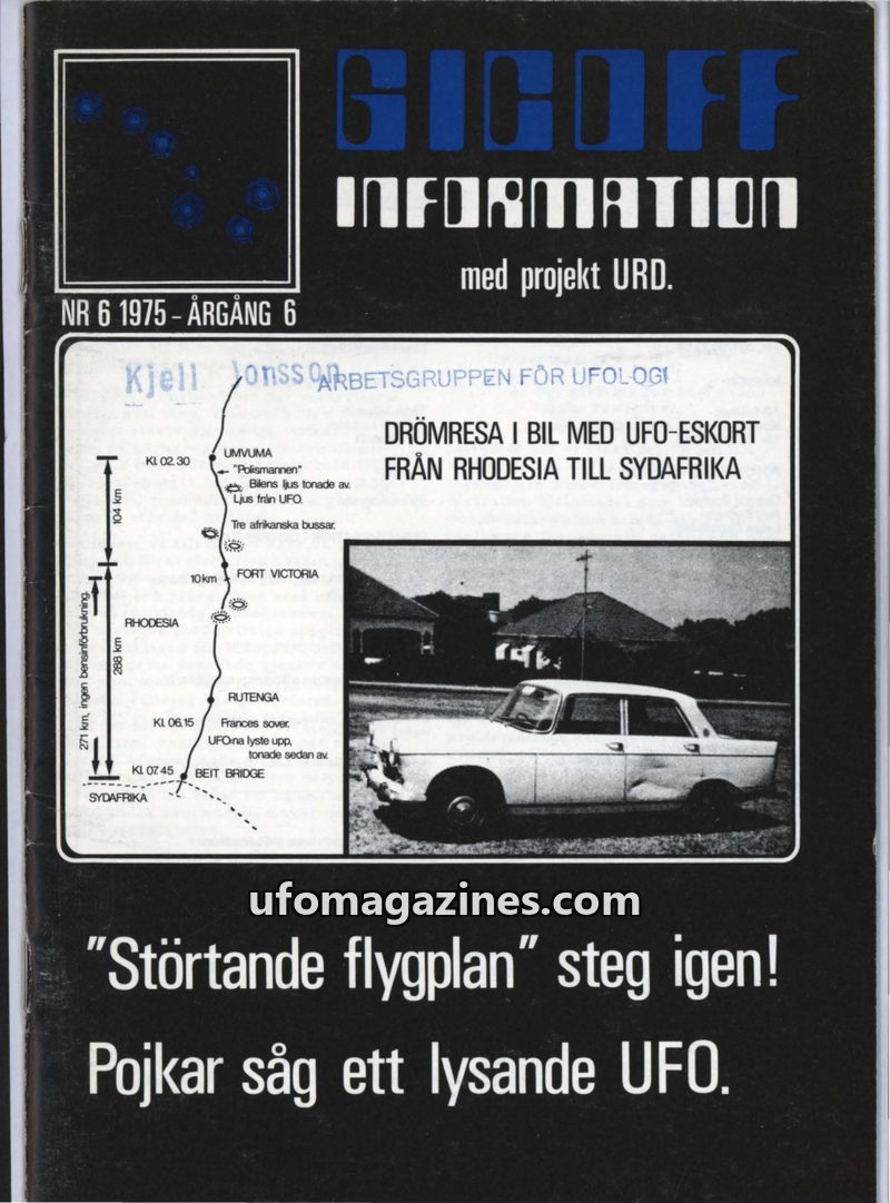 This issue of GIGOFF Information from 1975 features several UFO sighting reports, including a prominent case in Haverö, Sweden, where a family observed a UFO over power lines, expe