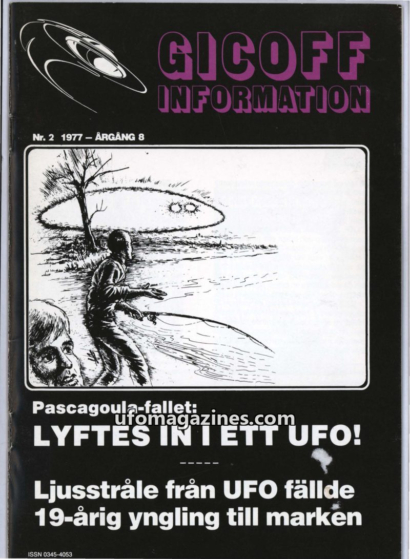 This issue of GICOFF INFORMATION focuses on UFO phenomena, prominently featuring the Pascagoula abduction case where Charles Hickson and Calvin Parker reported being taken aboard a