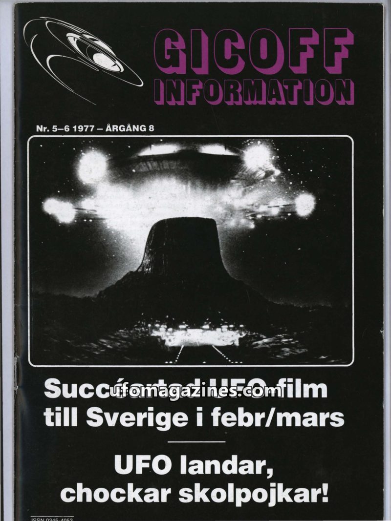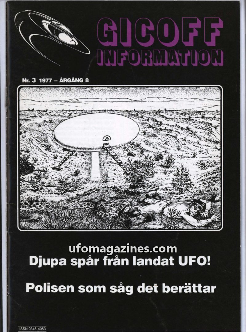This issue of GICOFF Information from 1977 covers a range of UFO-related topics. It highlights the release of a successful UFO film in Sweden and details a significant UFO landing