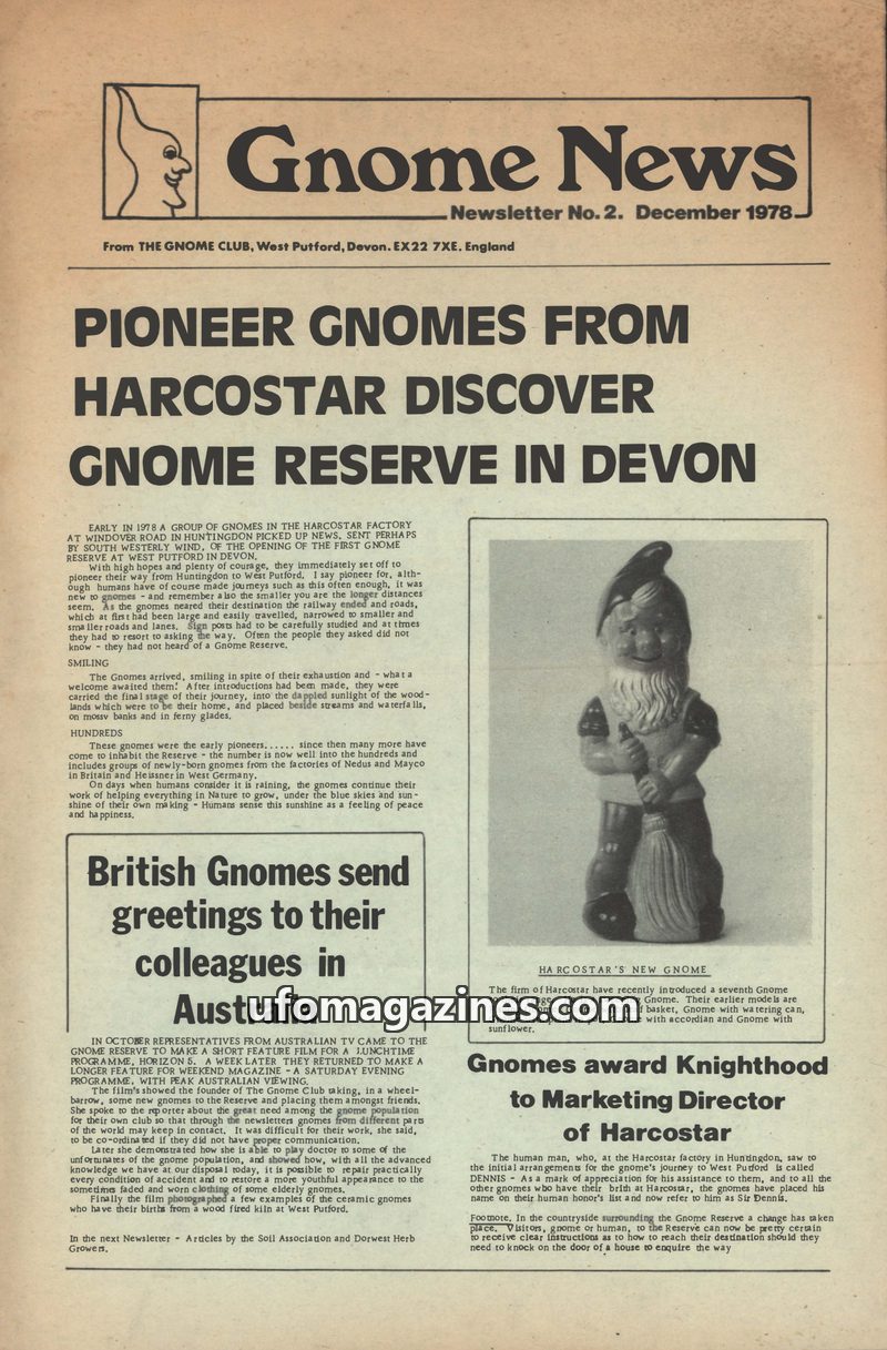 This issue of Gnome News, dated December 1978, focuses on the establishment and activities surrounding the Gnome Reserve in West Putford, Devon. It details the journey of 'pioneer