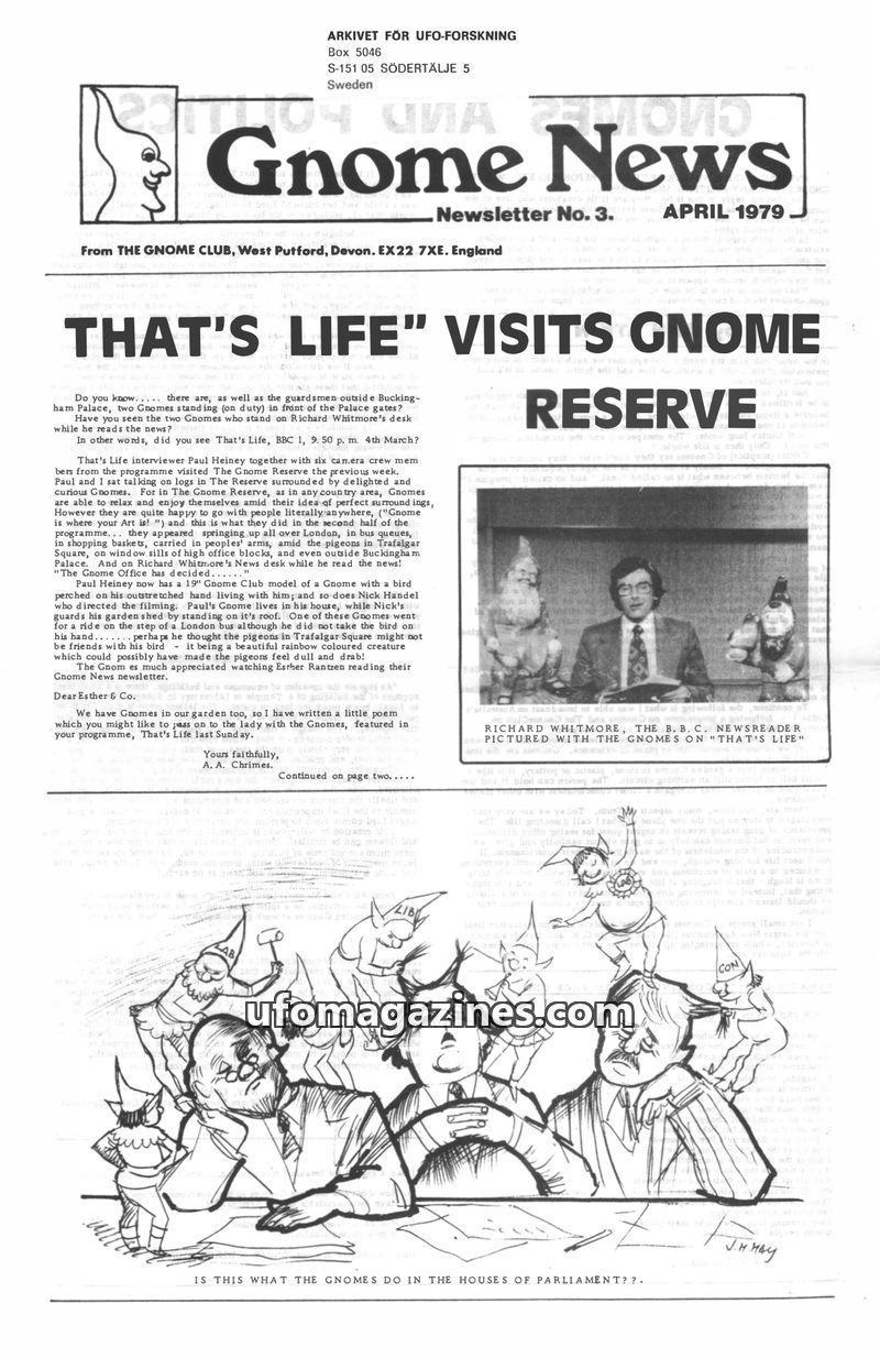 This issue of Gnome News from April 1979 highlights a visit from the BBC's 'That's Life' to The Gnome Reserve, exploring the concept of gnomes and their potential political signifi