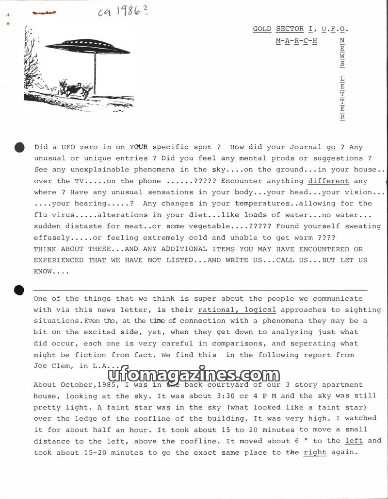 This March 1986 newsletter from GOLD SECTOR I, U.F.O. features a report from Joe Clem in Los Angeles detailing a slow-moving, star-like object observed in October 1985. It also dis