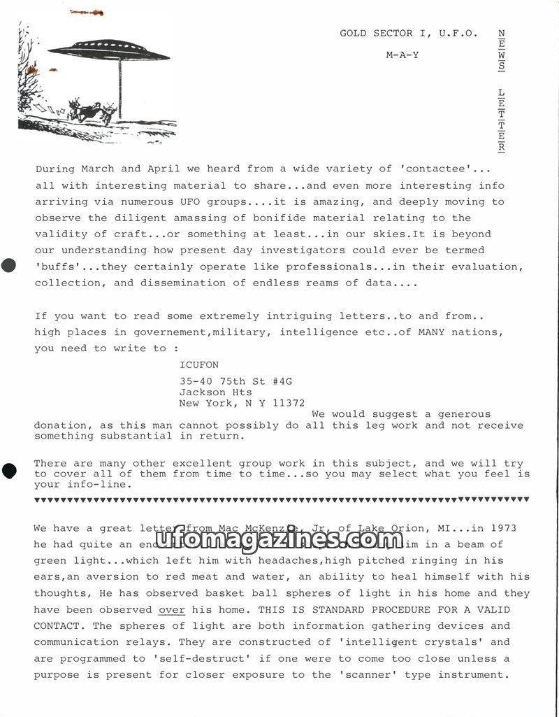 This issue of the UFO Newsletter highlights 'contactee' experiences, including a detailed account from Mac McKenzie Jr. in 1973 involving a UFO encounter with green light and spher