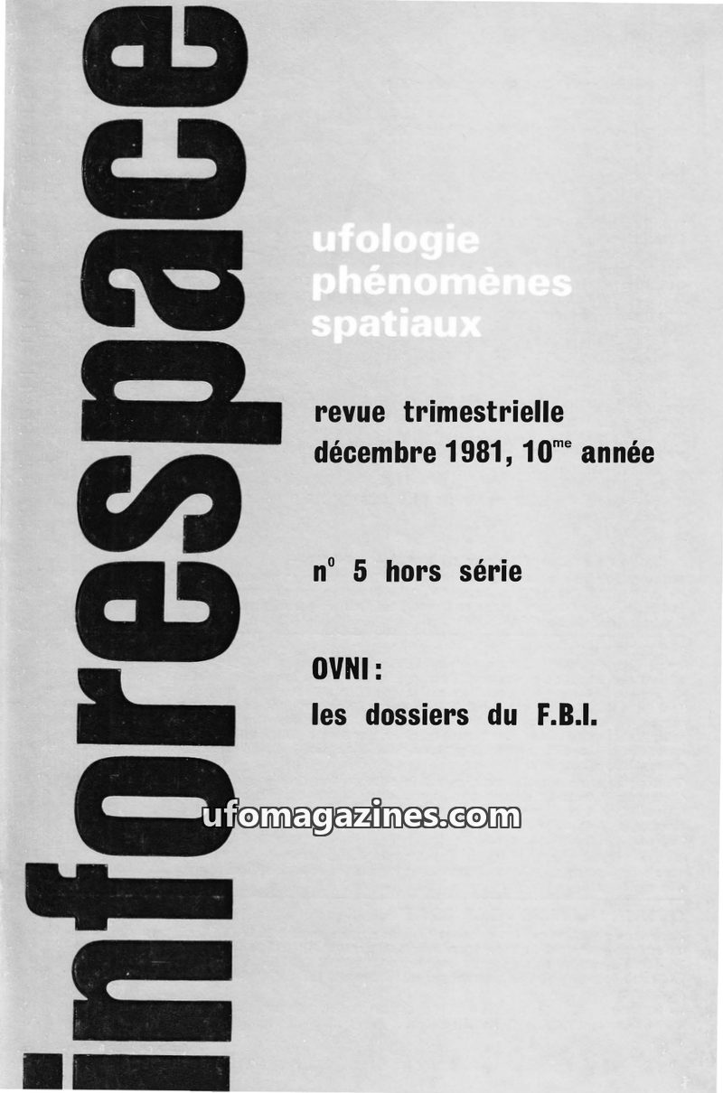 This special issue of Inforespace, dated December 1981, focuses on the FBI's official and unofficial involvement in UFO investigations. It details the FBI's mandate from July to Oc