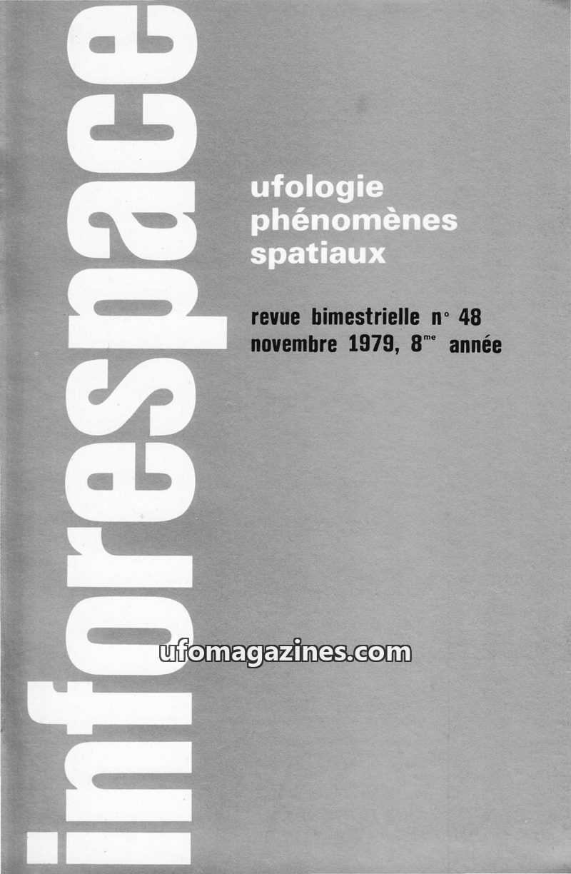 This issue of Inforespace (n°48, November 1979) focuses on ufology and spatial phenomena. It includes an editorial discussing the magazine's activities and future plans, a roundtab