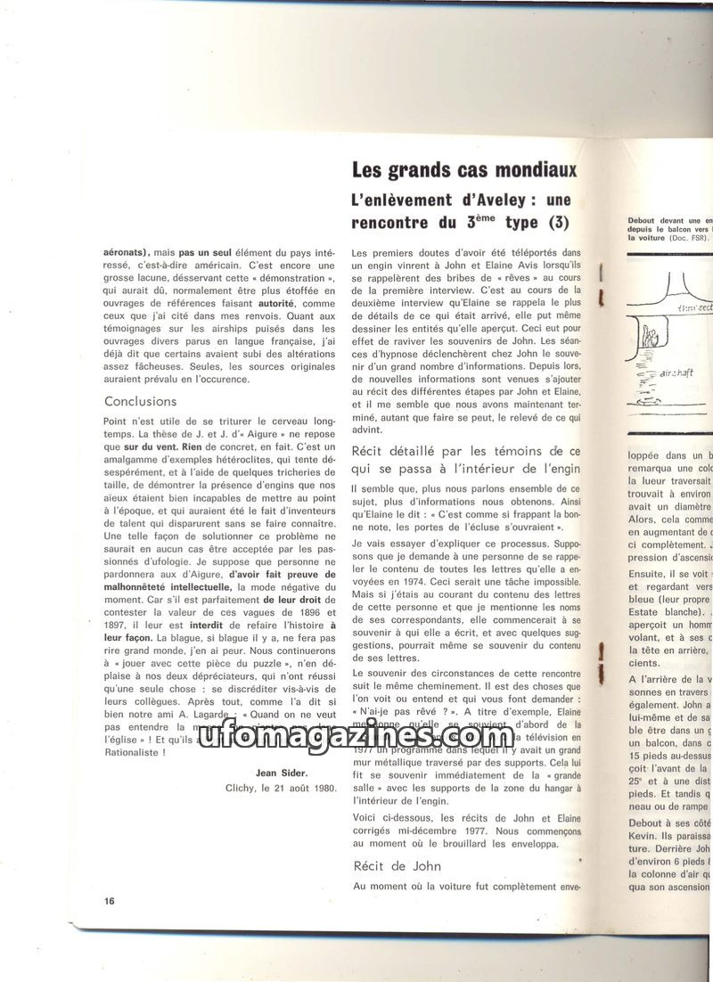 This issue details the Aveley abduction case, focusing on the testimonies of John and Elaine Avis. The couple recounts being teleported into an alien craft, undergoing examinations