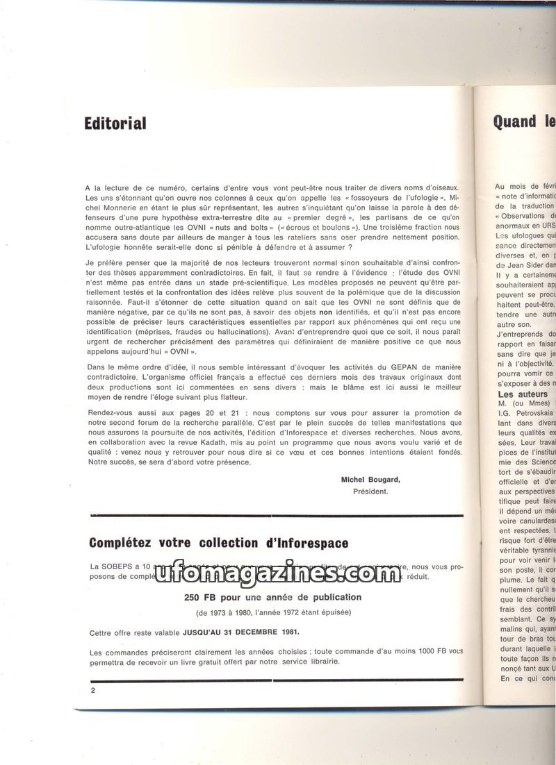 This issue of Inforespace, published by the Belgian Society for the Study of Spatial Phenomena (SOBEPS), addresses the challenges facing ufology and the organization itself. The ed