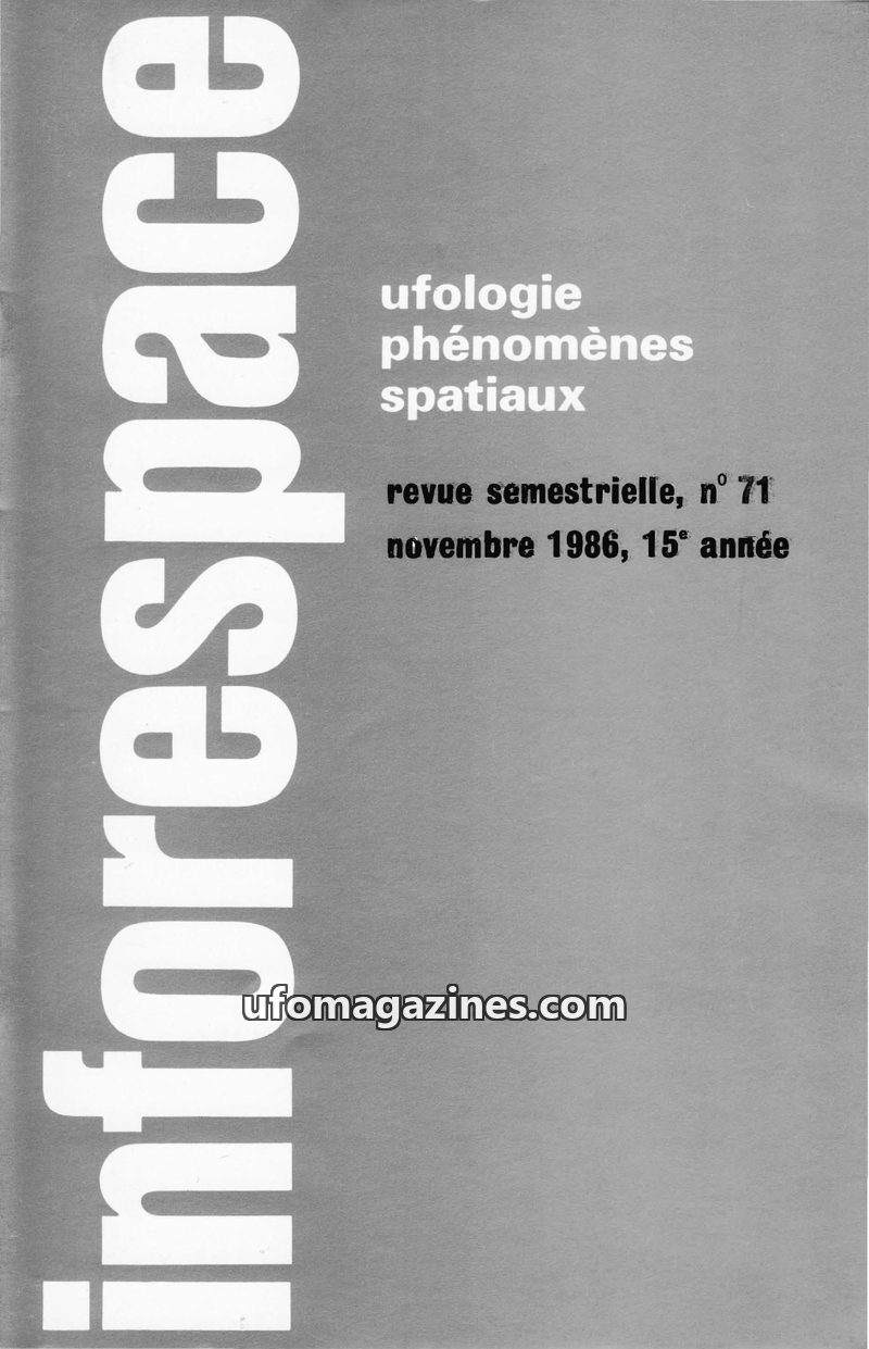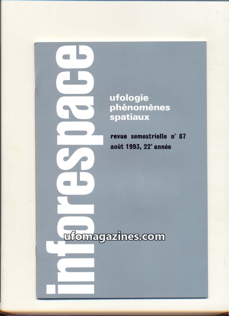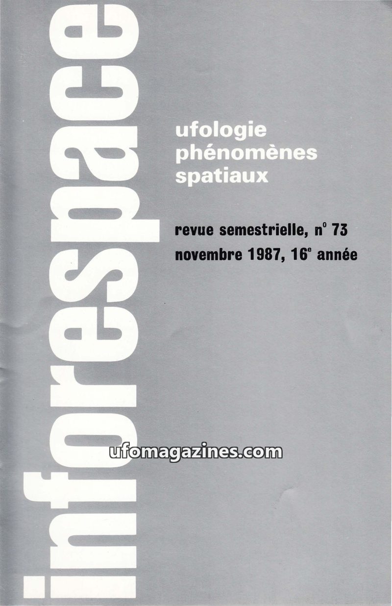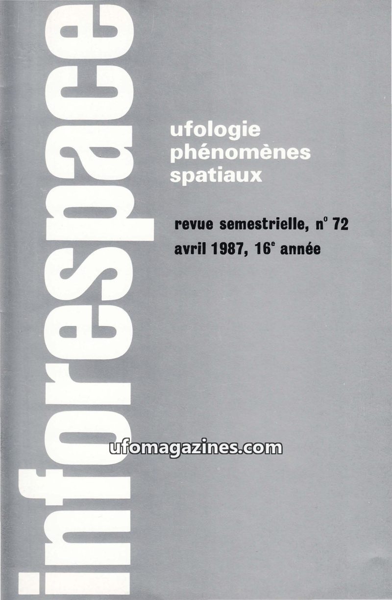 This issue of Inforespace (No. 72, April 1987) focuses on ufology and space phenomena. It includes an editorial by Pascal Deboodt discussing the state of ufology and the magazine's