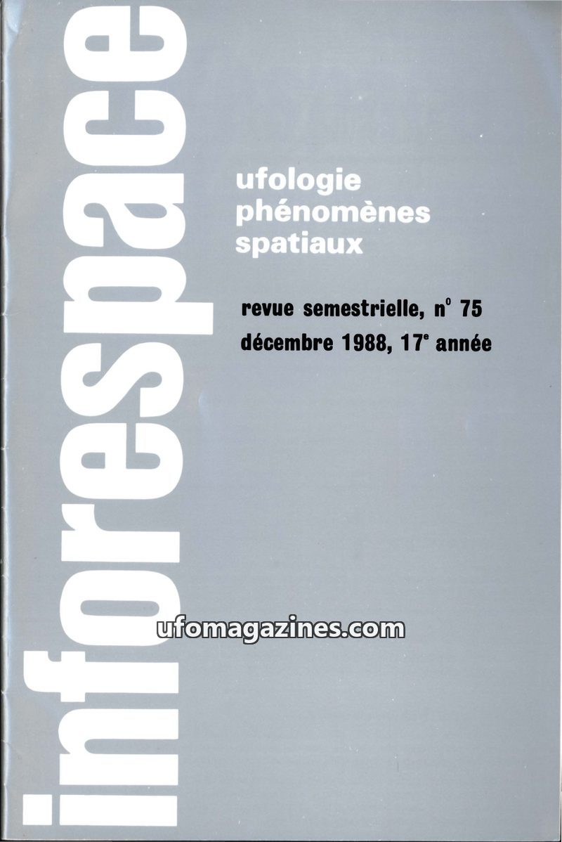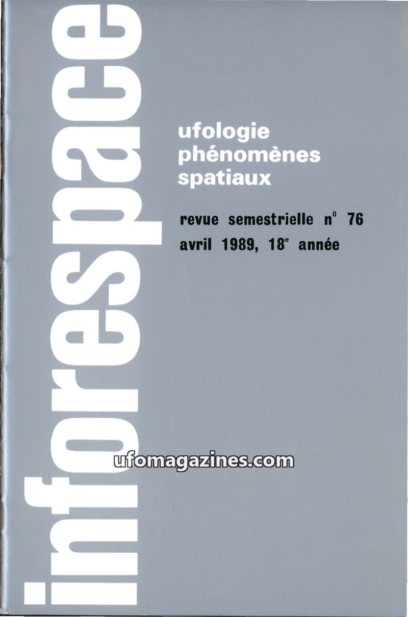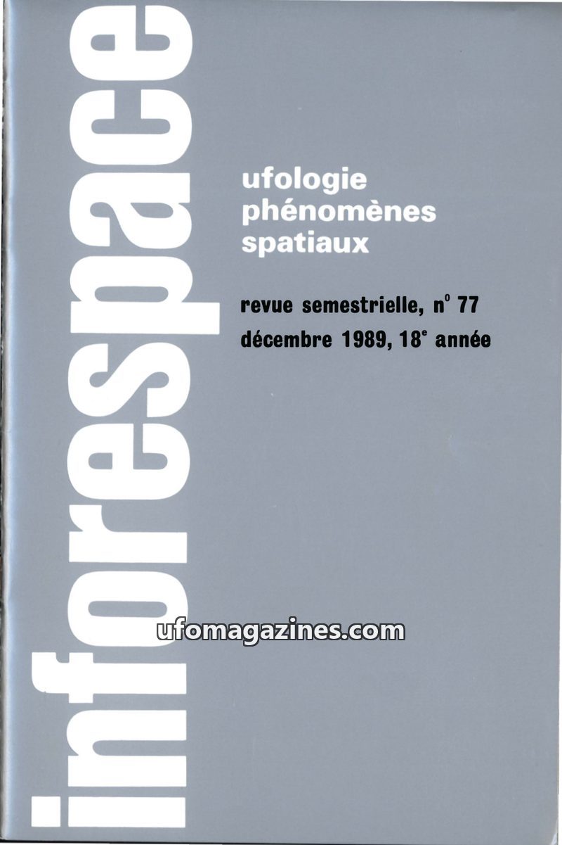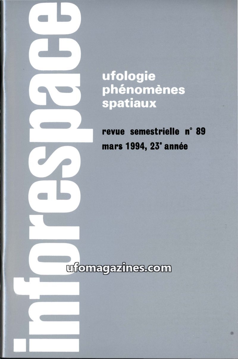 This issue of Inforespace, published in December 1989, focuses on ufology and spatial phenomena, with a special emphasis on 'abductions'. It features an editorial by Patrick Vidal