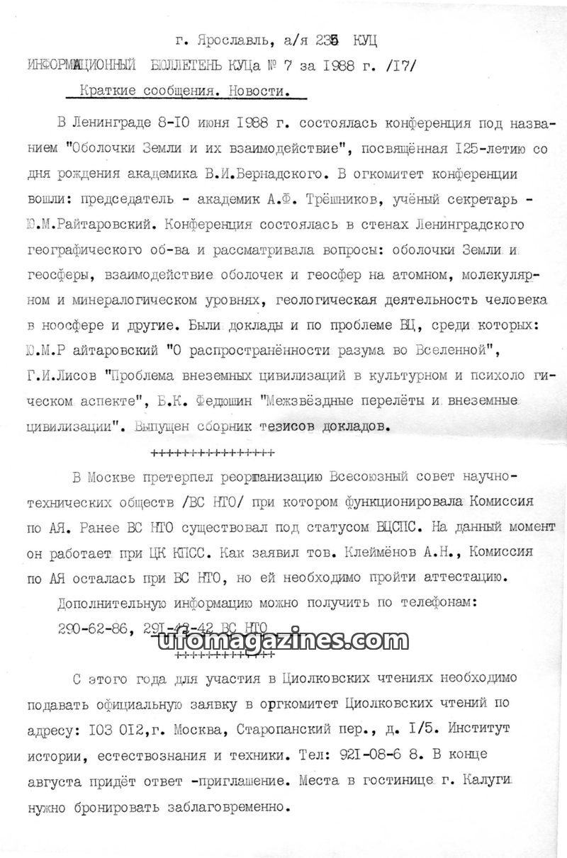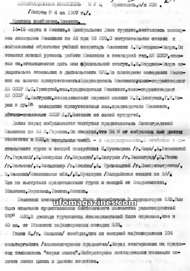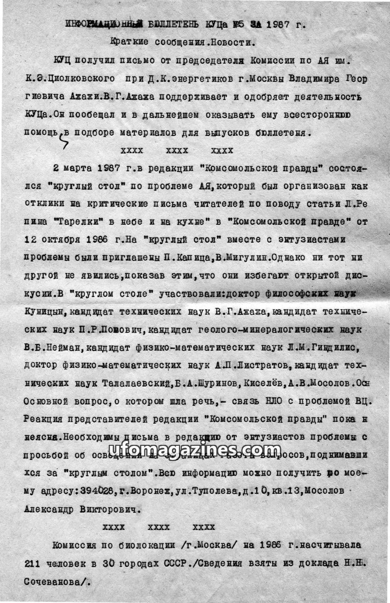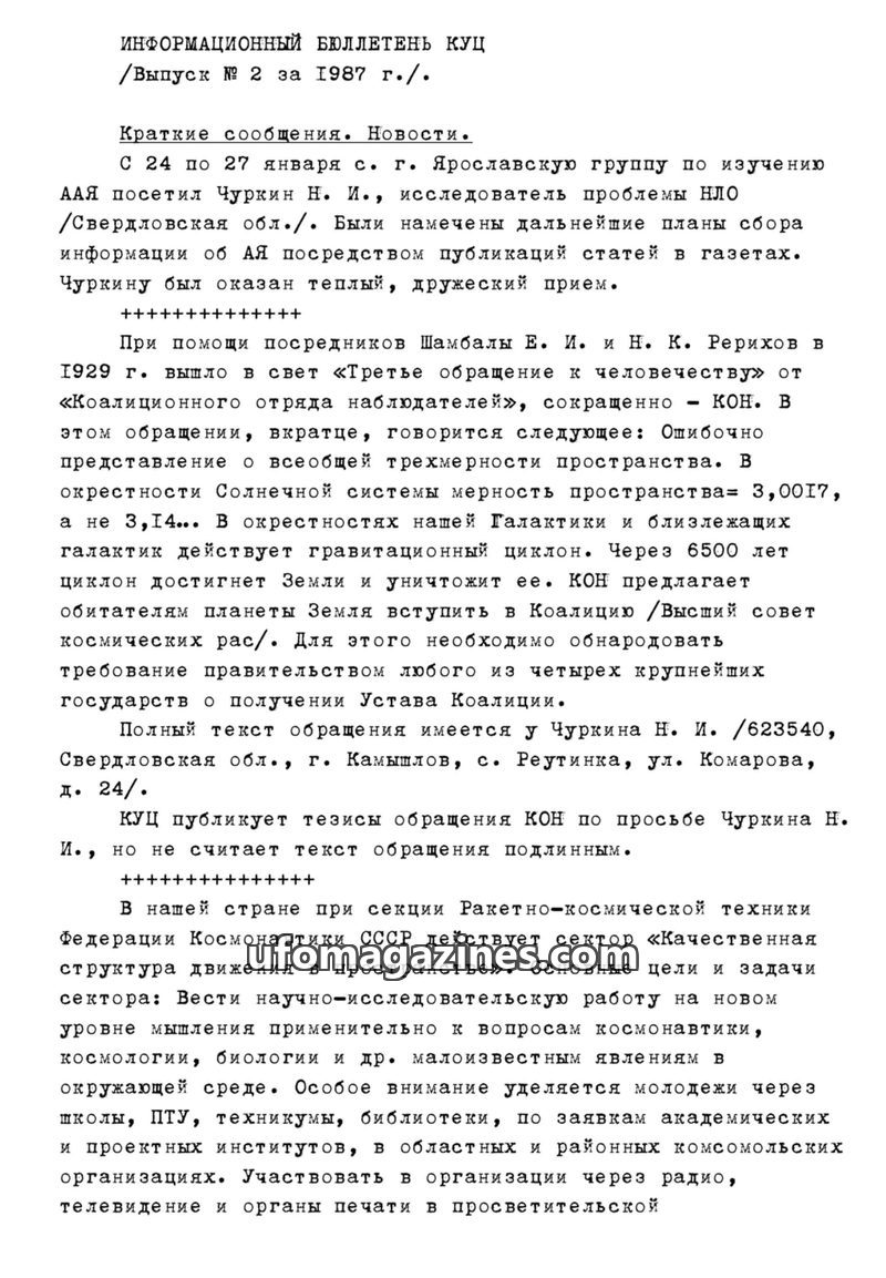 This issue of the KUTs Information Bulletin from 1987 covers recent UFO-related news and events. It includes a letter of support from Vladimir Azhazha, chairman of the K.E. Tsiolko