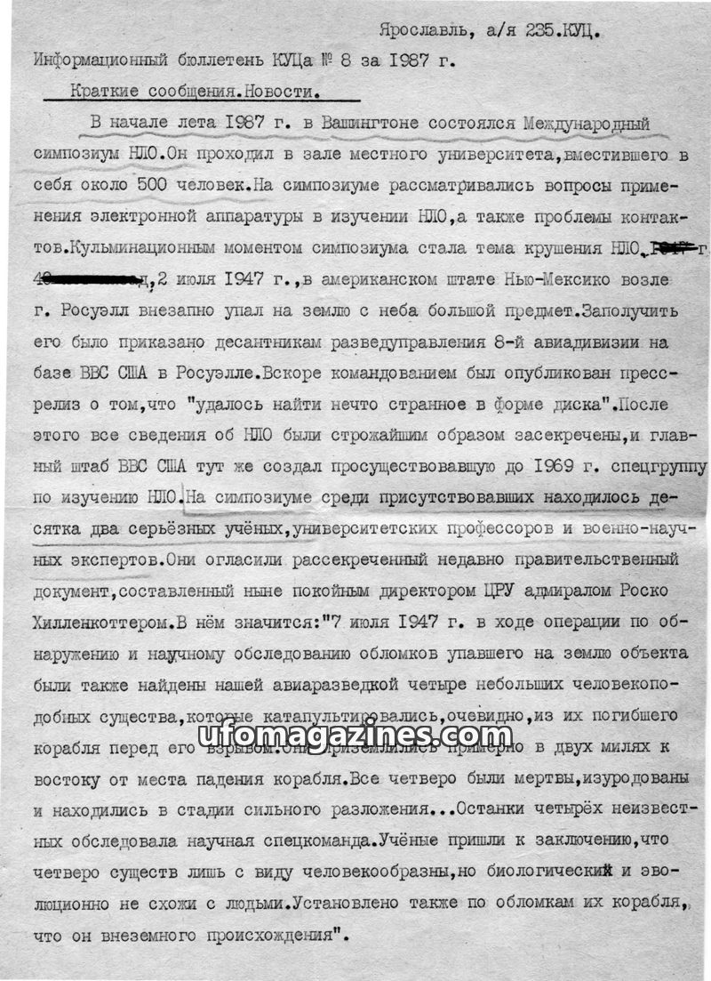 This issue of the KUTs Information Bulletin from 1987 reports on an international UFO symposium in Washington where a declassified CIA document revealed details of the 1947 Roswell
