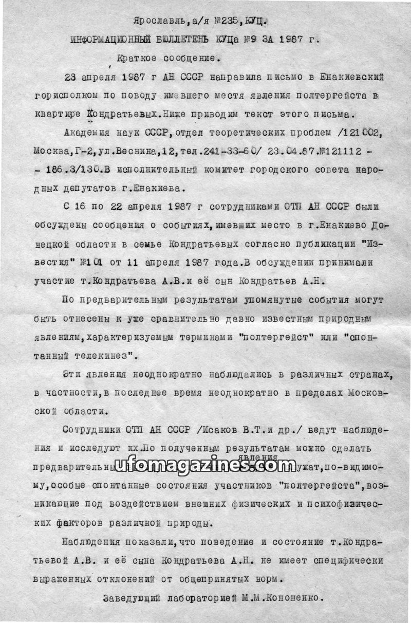 This issue of the KUTS Information Bulletin reports on a poltergeist phenomenon investigated by AN USSR in Enakievo, Ukraine, involving the Konratyev family. Preliminary findings s