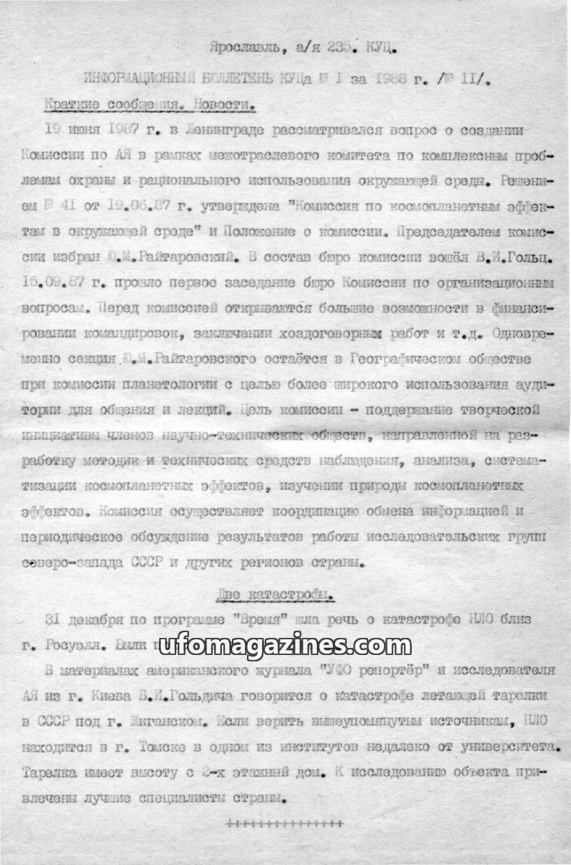 This issue of the KUTs Information Bulletin from 1988 details the establishment and activities of a UAP commission in Leningrad, including its organizational structure and goals. I