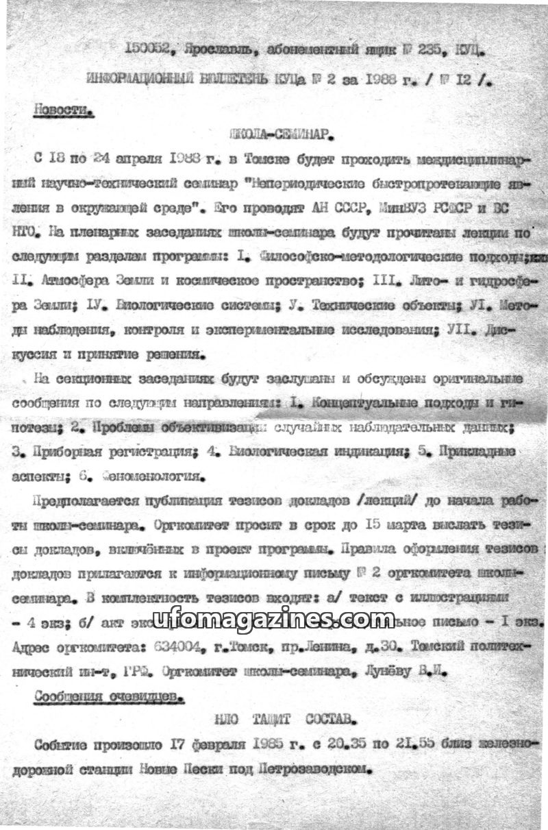 This issue of the KUTS Information Bulletin from 1988 covers a scientific seminar on environmental phenomena in Tomsk and reports on several UFO sightings. One incident involved a