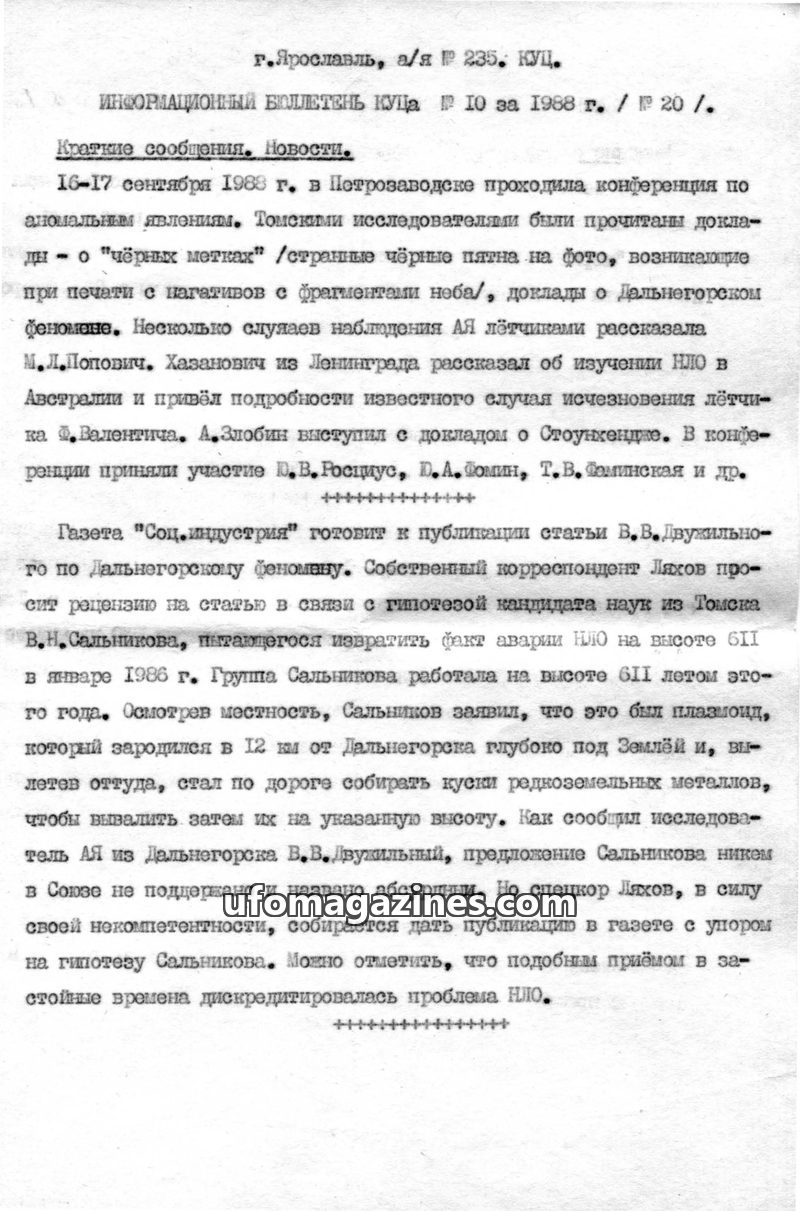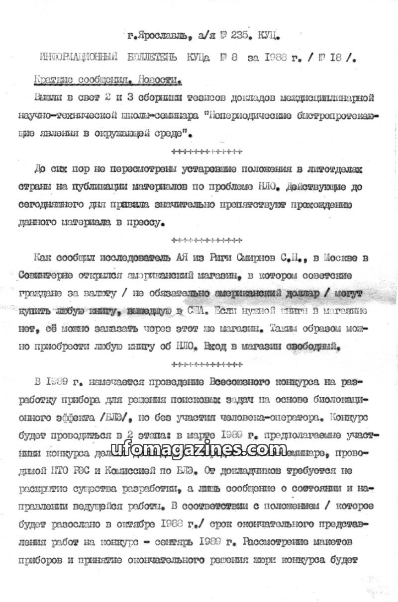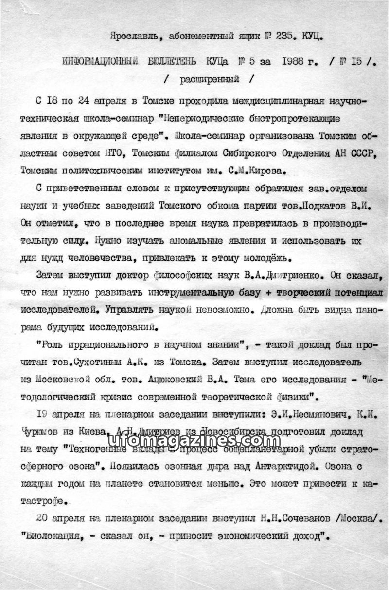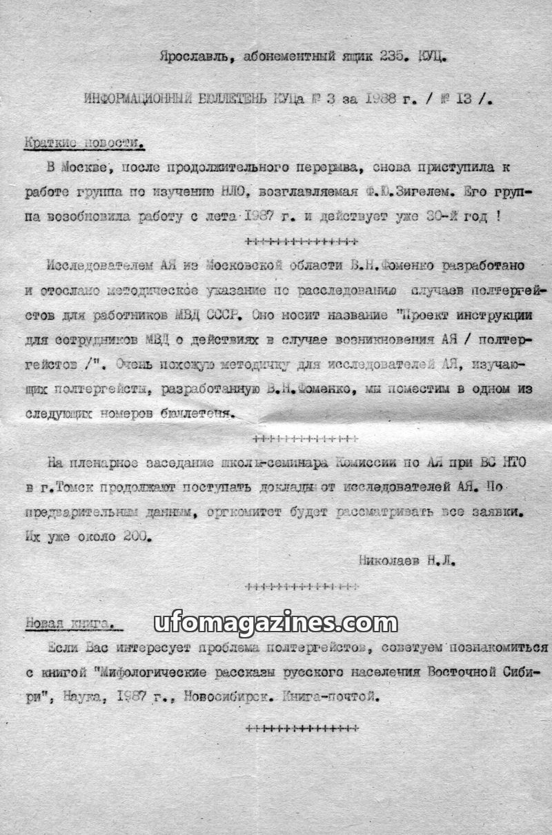 This issue of the KUTSA Information Bulletin from 1988 reports on UFO research activities. A group in Moscow led by F.Yu. Zigel has resumed its work. Researcher V.N. Fomenko has de