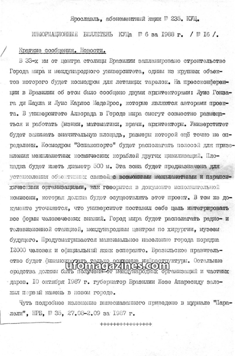 This issue of the KUTS Bulletin covers a range of topics including a planned 'World City' and international university in Brazil with a spaceport for flying saucers, a legal case i