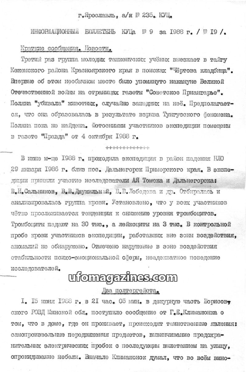 This issue of the KUTS Information Bulletin from 1988 details several unusual events. It reports on an ongoing search for a mysterious 'Devil's Graveyard' in Siberia, possibly link
