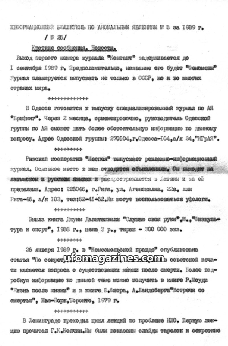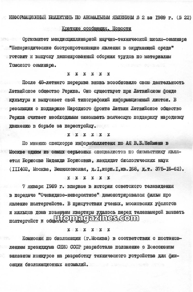 This issue of the bulletin covers various anomalous phenomena reported in the USSR during 1989. It includes announcements about new specialized journals on UFOs ('Fenomeny' and 'Br