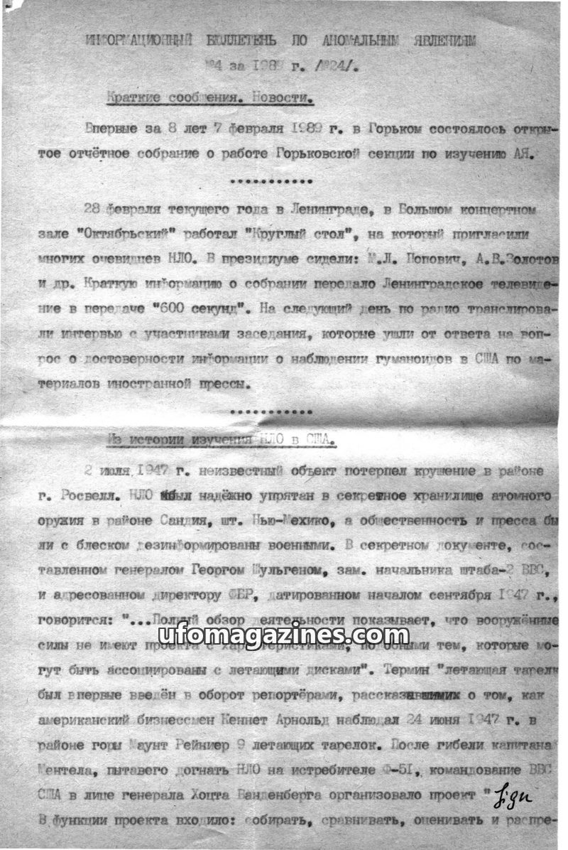 This issue of the Information Bulletin on Anomalous Phenomena covers various UFO-related events and historical projects. It details meetings and discussions on UFOs in Gorky and Le
