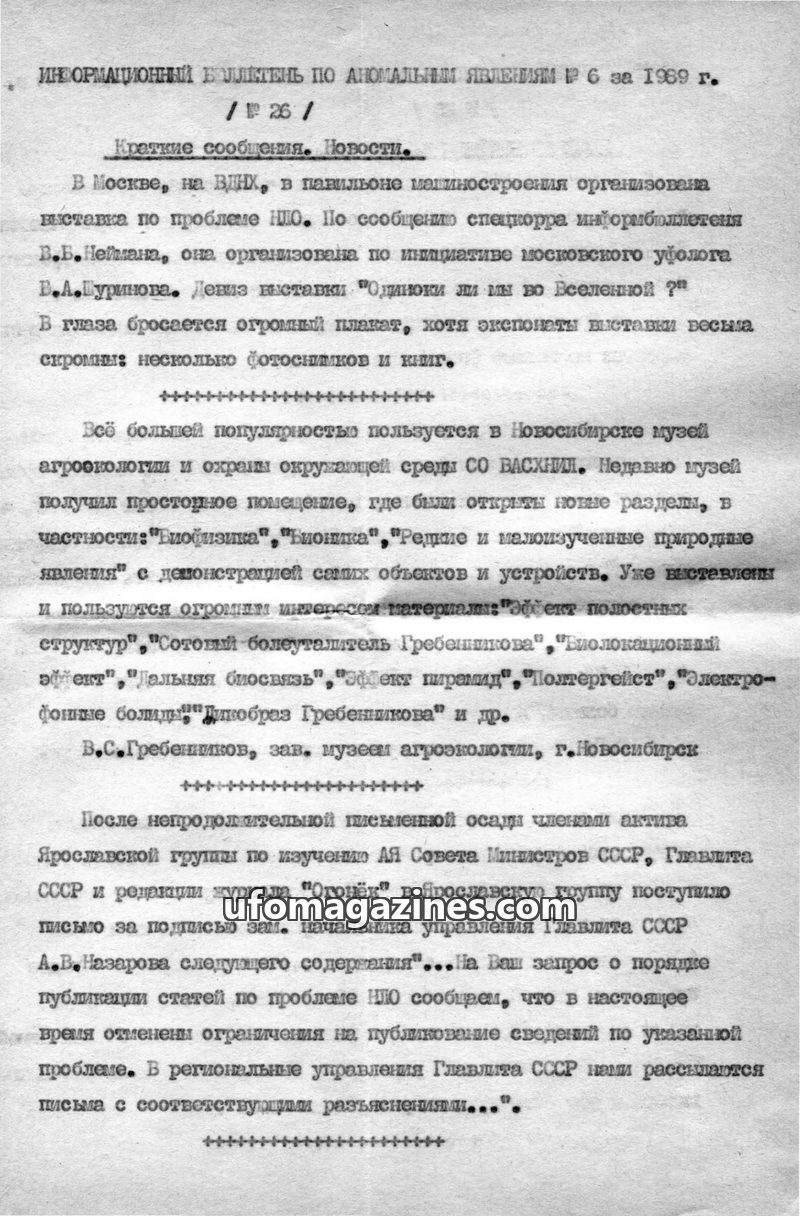 This issue of the 'Information Bulletin on Anomalous Phenomena' from 1969 details a UFO exhibition in Moscow organized by ufologist V.A. Shurinov, and the popular agroecology museu
