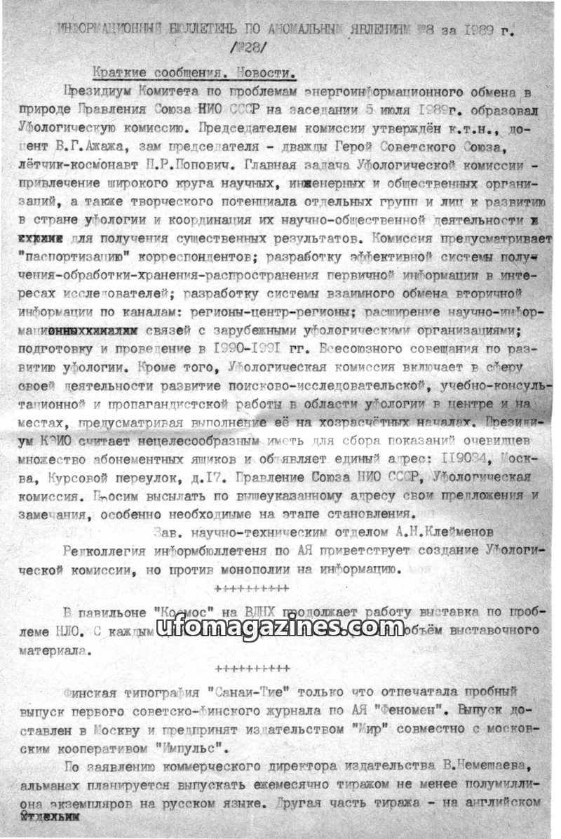 This issue of the Information Bulletin on Anomalous Phenomena from 1989 details the formation of a Ufology Commission in the USSR, aiming to coordinate research and public involvem
