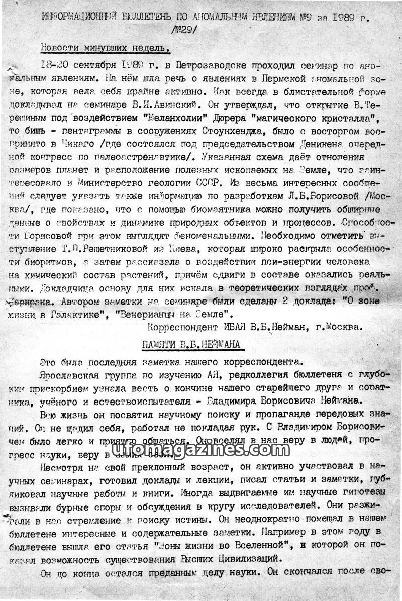 This issue of the 'Information Bulletin on Anomalous Phenomena' from 1989 covers a range of unusual events and scientific discussions. It reports on a seminar in Petrozavodsk discu