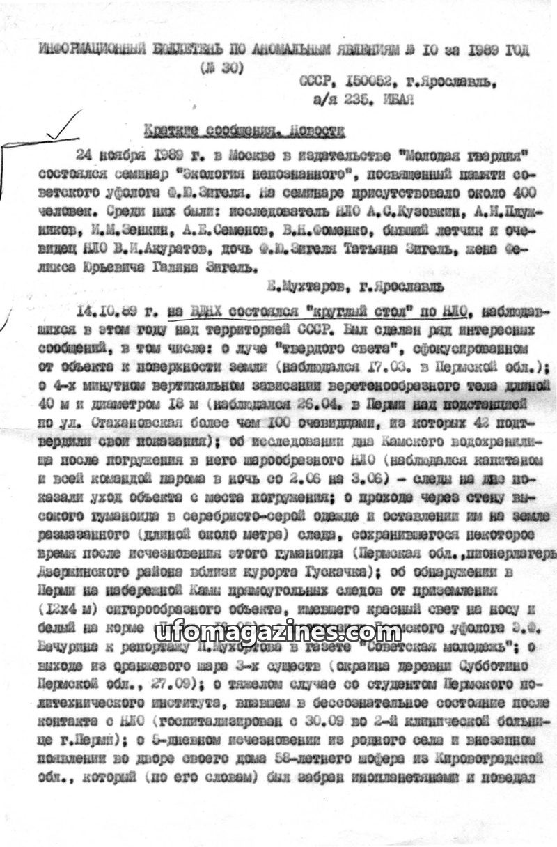 This issue of the UFO Bulletin details numerous anomalous phenomena and UFO sightings reported across the USSR in 1989. It covers events such as a seminar on 'Ecology of the Unknow