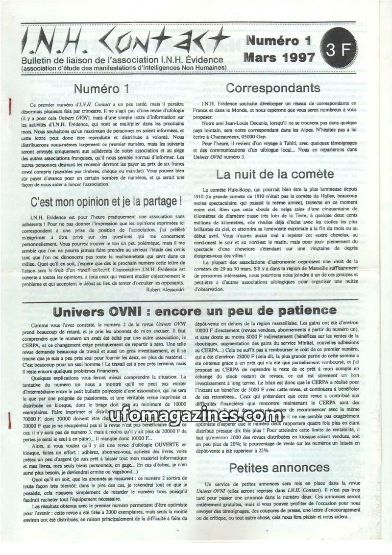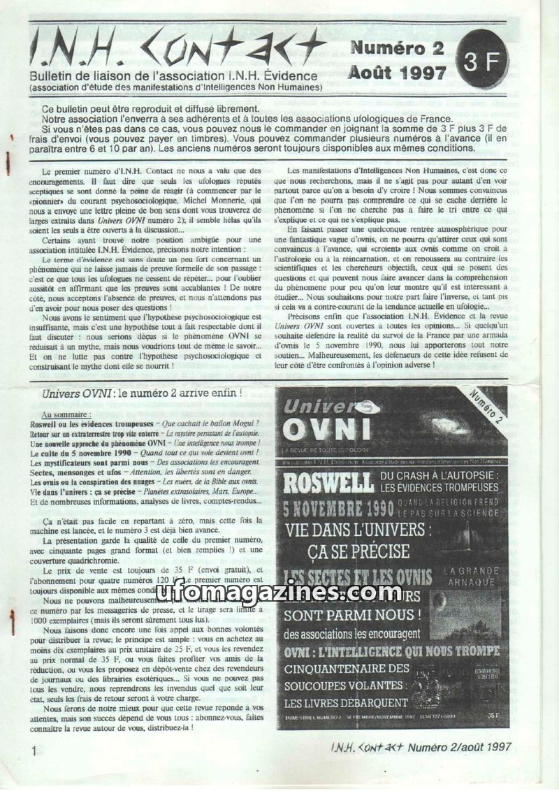 This inaugural issue of I.N.H. Contact, published by I.N.H. Évidence, focuses heavily on a critical analysis of the November 5, 1990 UFO wave in France. Author Robert Alessandri ar