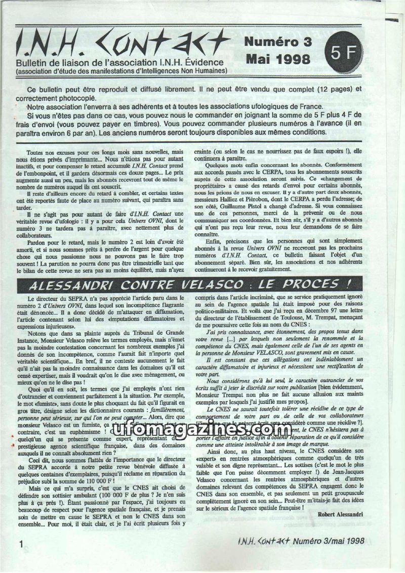 This issue of I.N.H. Kontakt focuses on the legal dispute between Robert Alessandri and Jean-Jacques Velasco of SEPRA, with Alessandri defending his critical article and Velasco su