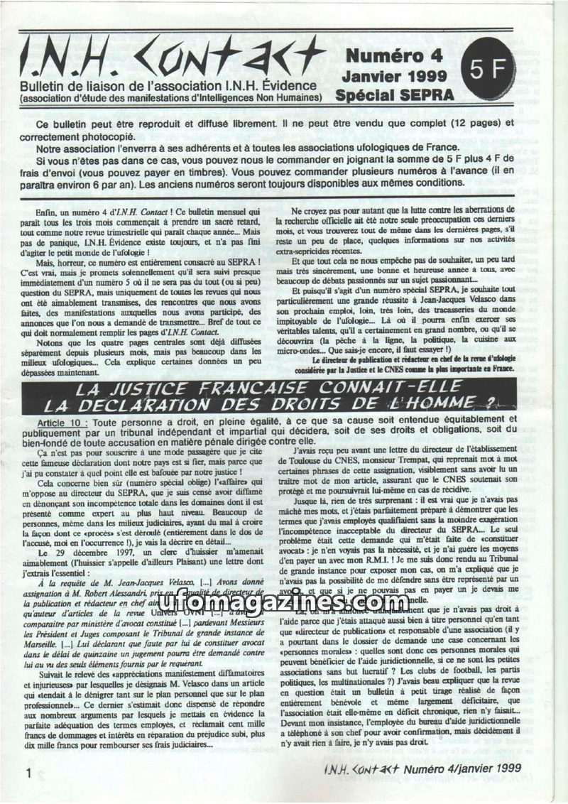 This issue of I.N.H. Contact focuses heavily on the legal and scientific controversies surrounding the SEPRA (Service d'Expertise des Phénomènes de Rentrée Atmosphérique) and its d