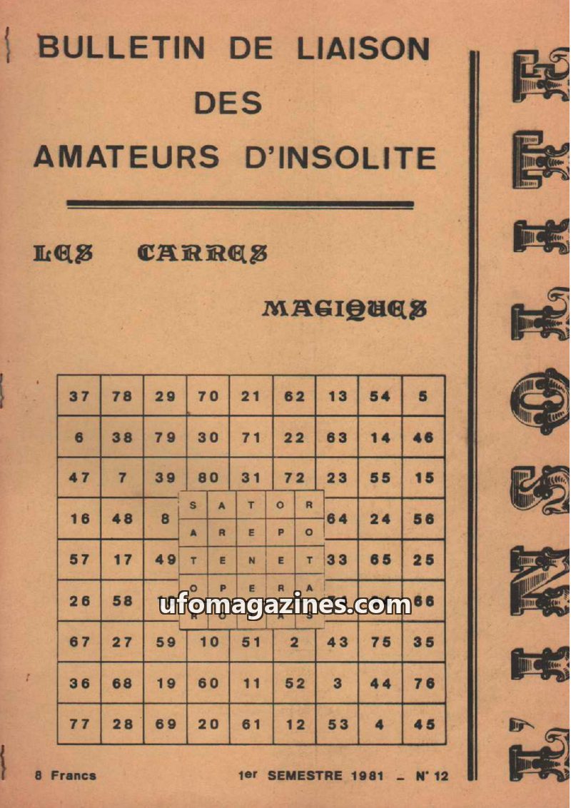 This issue of 'Bulletin de Liaison des Amateurs d'Insolite' (N°12, 1st semester 1981) features 'Magic Squares' on its cover. The content delves into historical and biblical narrati