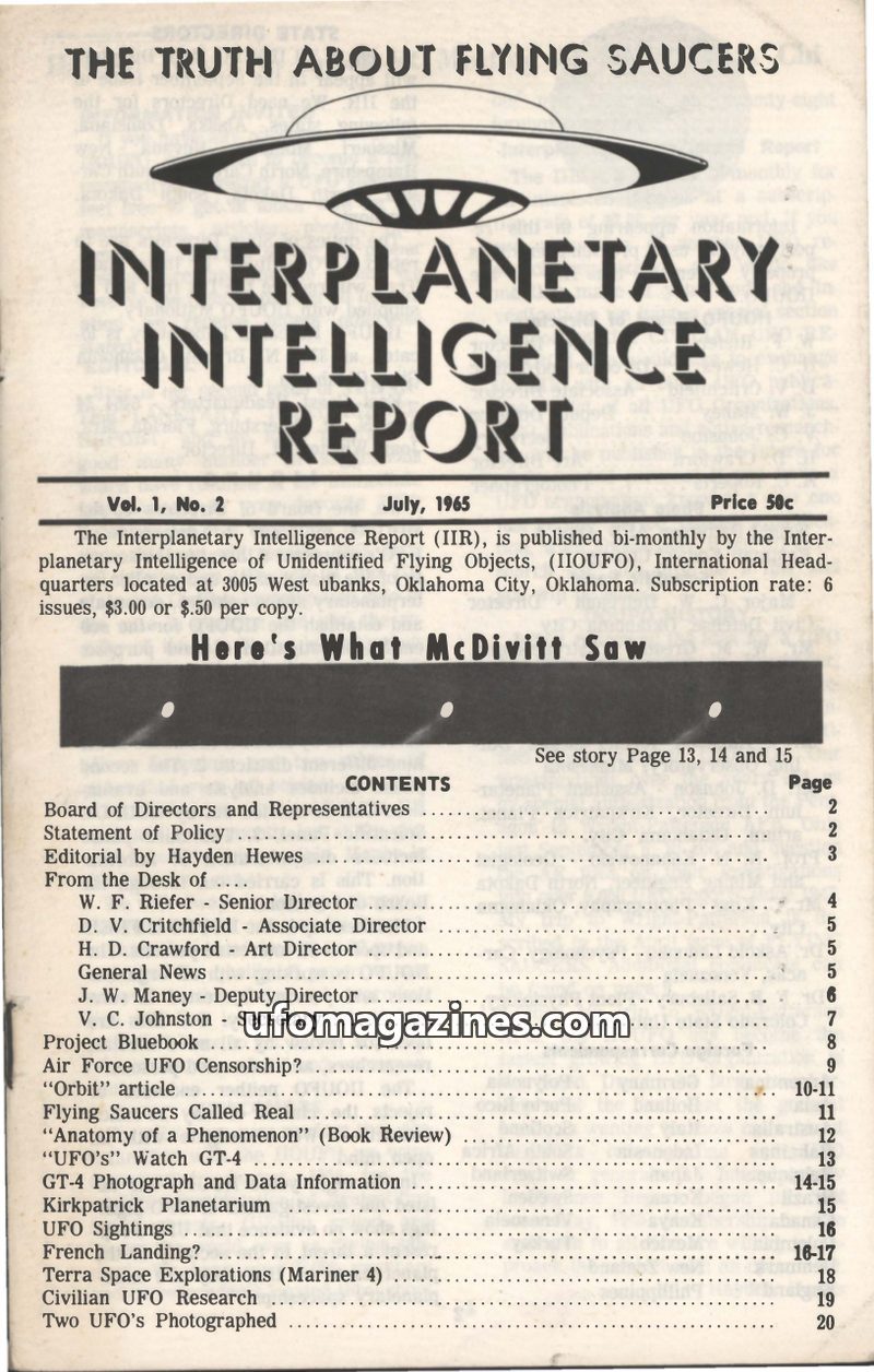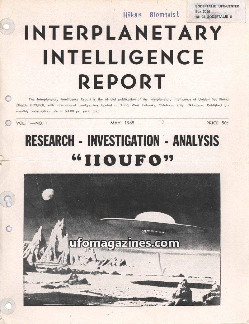 The inaugural issue of the Interplanetary Intelligence Report (IIR) from May 1965, published by the Interplanetary Intelligence of Unidentified Flying Objects (IIOUFO). The magazin