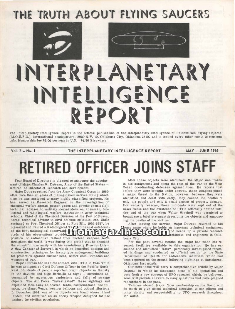 This issue of The Interplanetary Intelligence Report announces the appointment of Major Charles W. Dutreau as Director of Research and Development. It details investigations into U