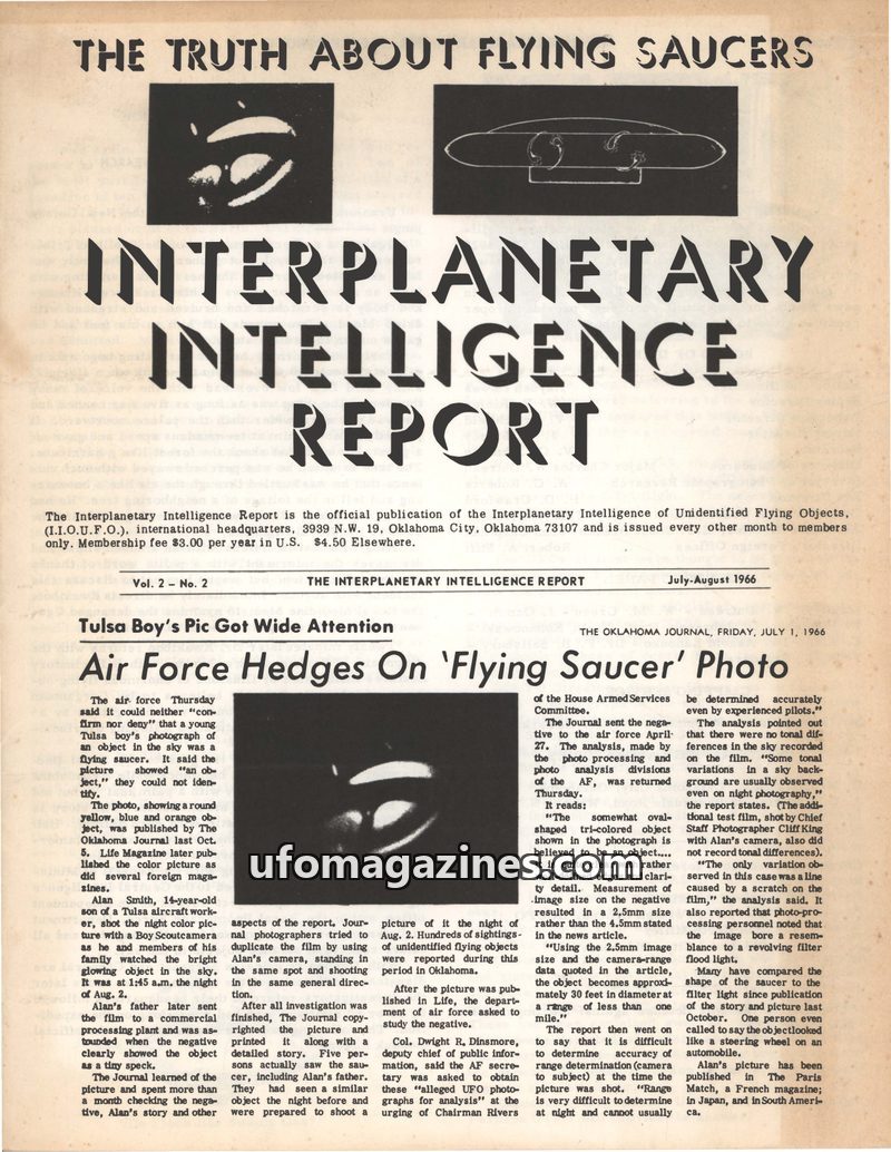 This issue of the Interplanetary Intelligence Report focuses on the analysis of a UFO photograph taken by Alan Smith in Tulsa, Oklahoma. The Air Force's official stance was to neit