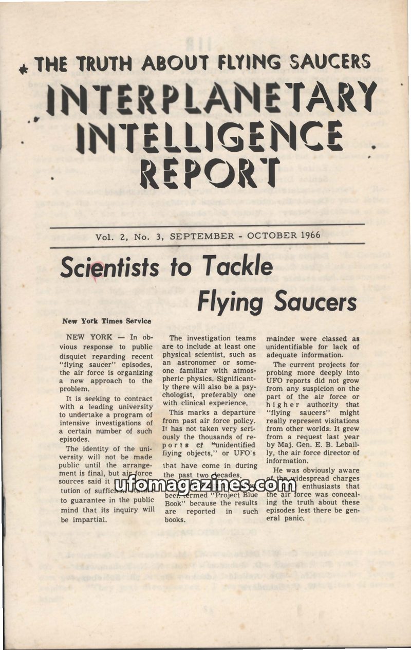 The September-October 1966 issue of the Interplanetary Intelligence Report details the U.S. Air Force's new initiative to contract with a university for intensive UFO investigation