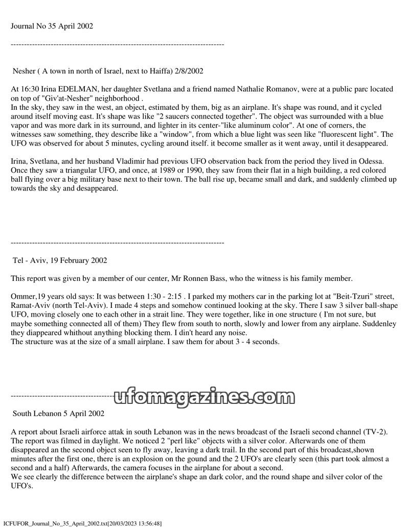 This issue of Journal reports on three distinct UFO sightings in Israel and one in South Lebanon during early 2002. The Nesher sighting on August 2, 2002, involved a round object w