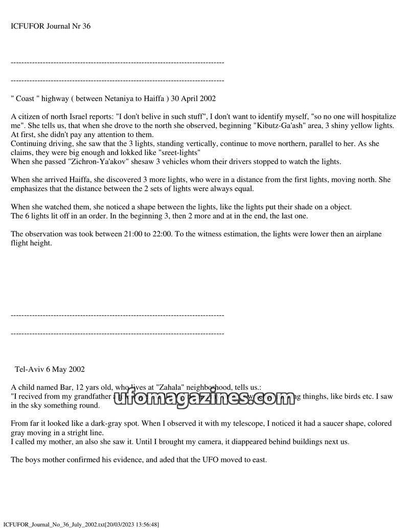 This issue of ICFUFOR Journal documents a series of UFO and UAP sightings across Israel between April and July 2002. Reports include multiple witnesses observing lights, disk-shape