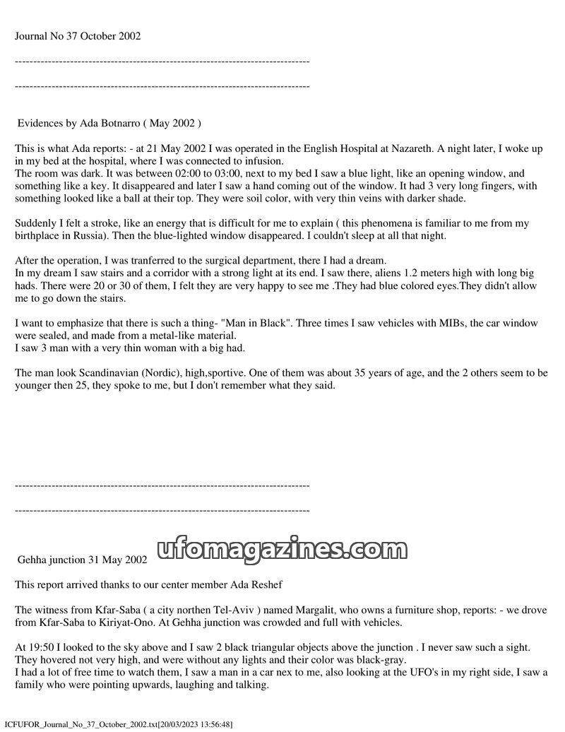 This issue of ICFUFOR Journal documents multiple UFO and UAP sightings in Israel during 2002, including a hospital experience with a blue light and hand, triangular objects over a