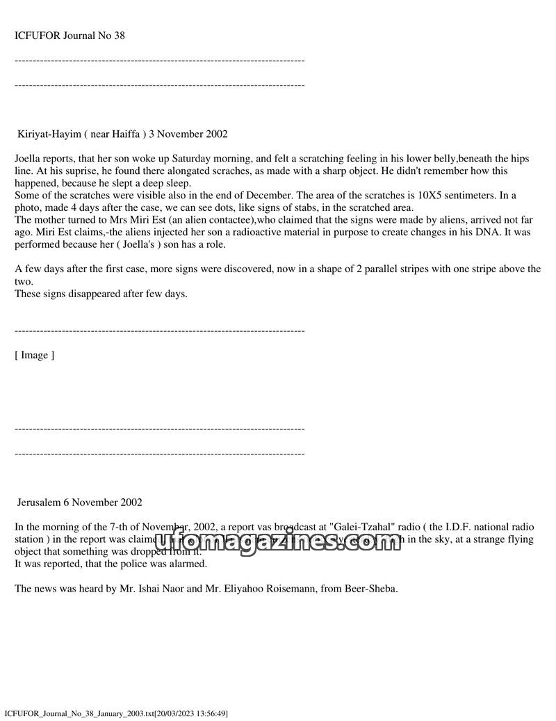 This issue of ICFUFOR Journal No 38 details multiple unexplained aerial phenomena (UAP) sightings reported in Israel during November and December 2002. Cases include physical marks
