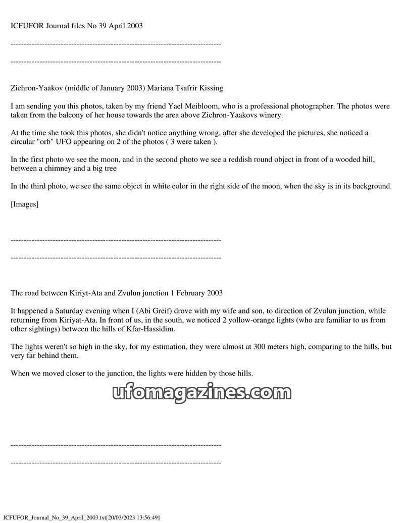 This issue of ICFUFOR Journal details several UFO sightings from early 2003 in Israel. Reports include photographic evidence of a circular orb near Zichron-Yaakov, observations of