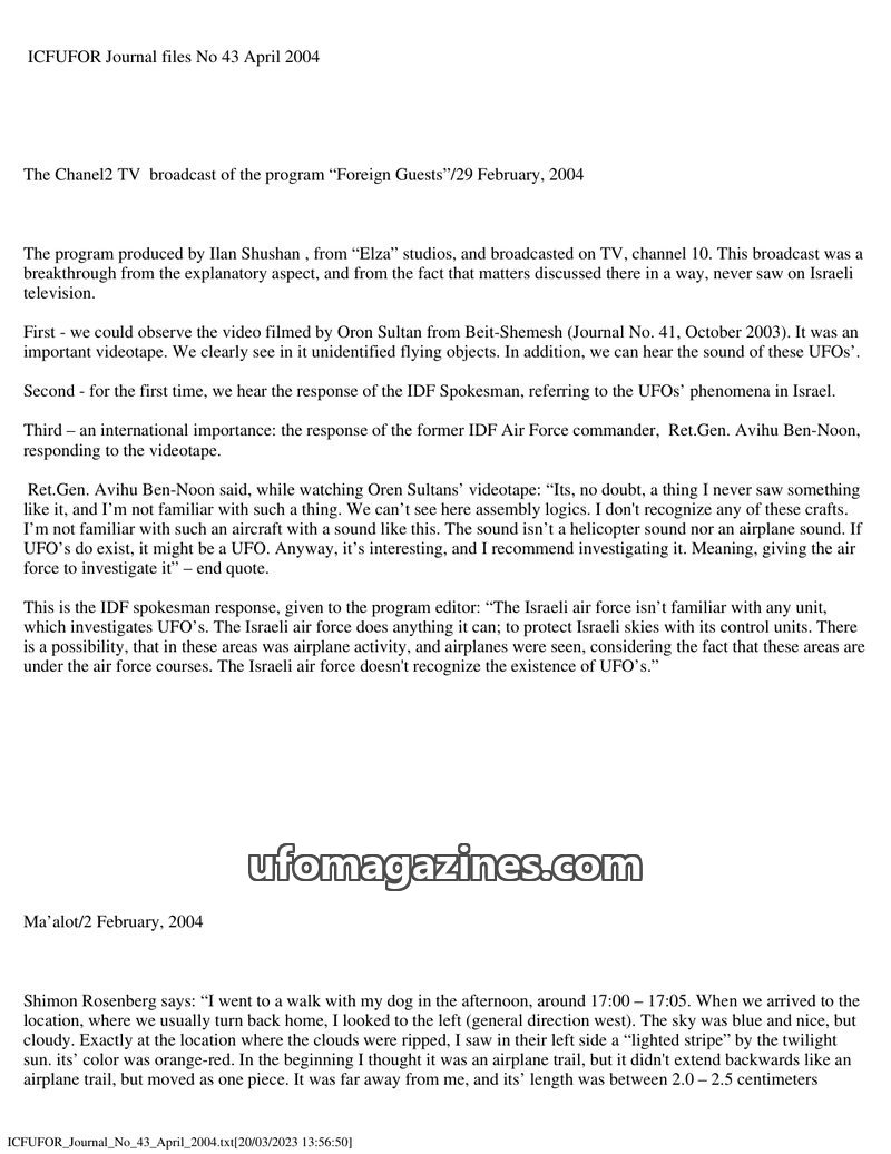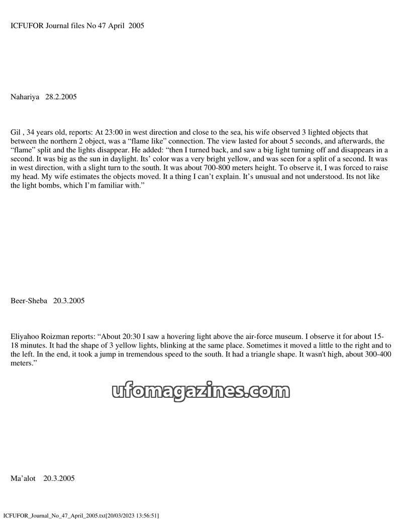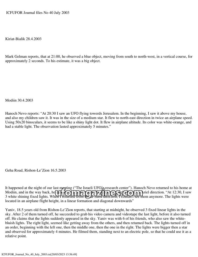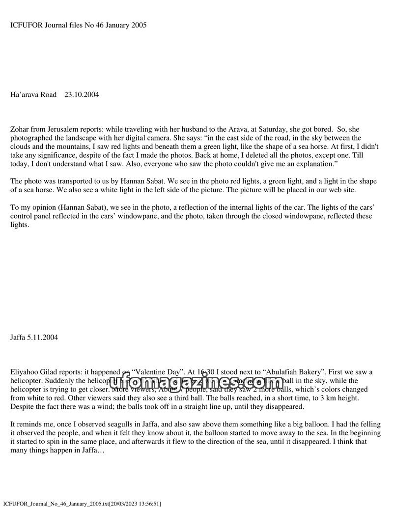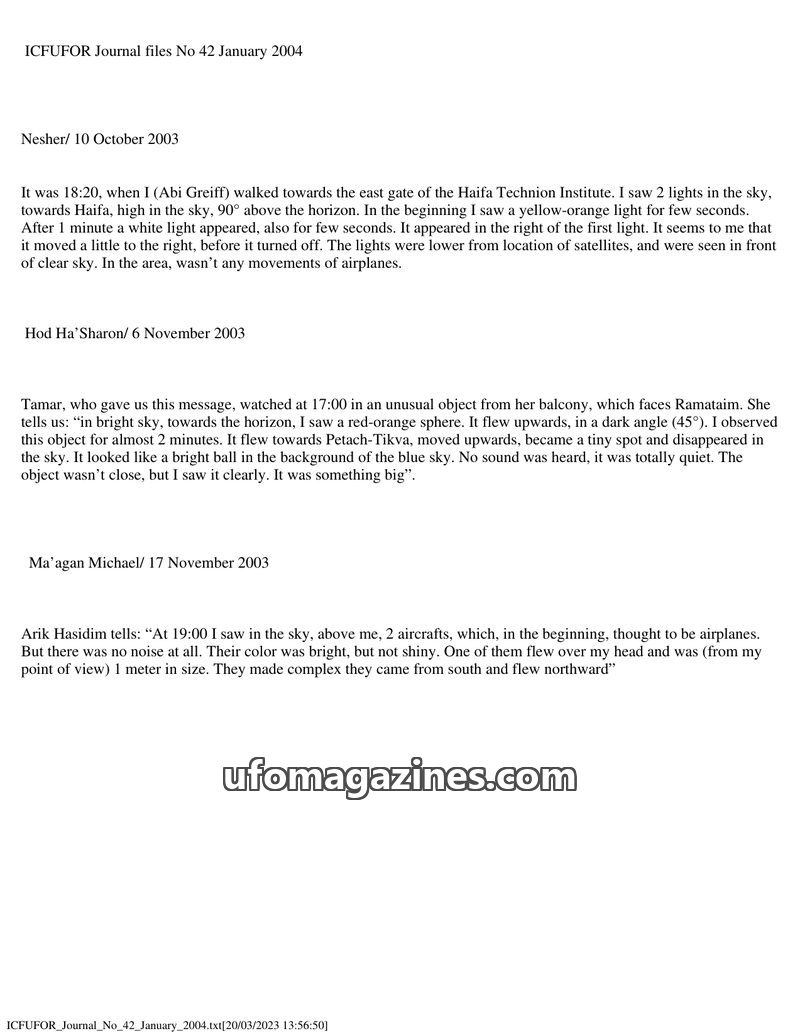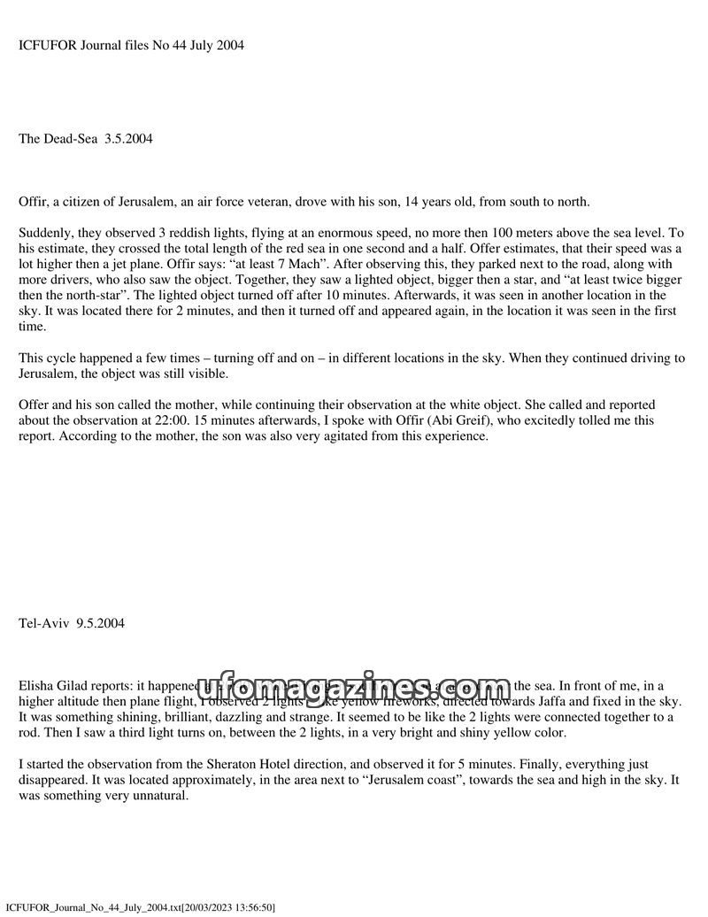 This issue of ICFUFOR Journal presents several witness accounts of unidentified aerial phenomena in Israel during March, May, June, and July of 2004. Reports detail sightings of li
