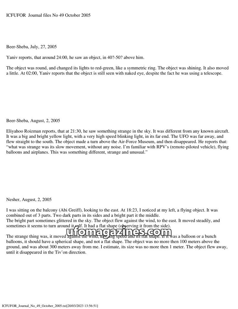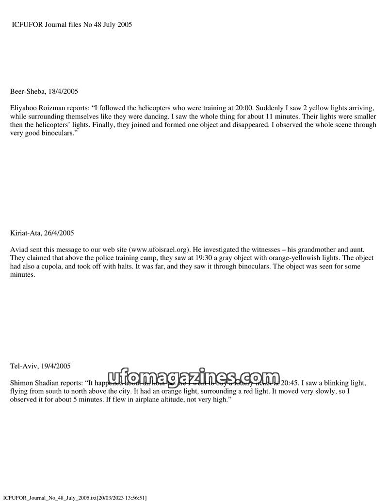 This issue of the ICFUFOR Journal documents a series of UFO and UAP sightings reported in Israel during April, May, June, and July 2005. The reports include observations of lights,