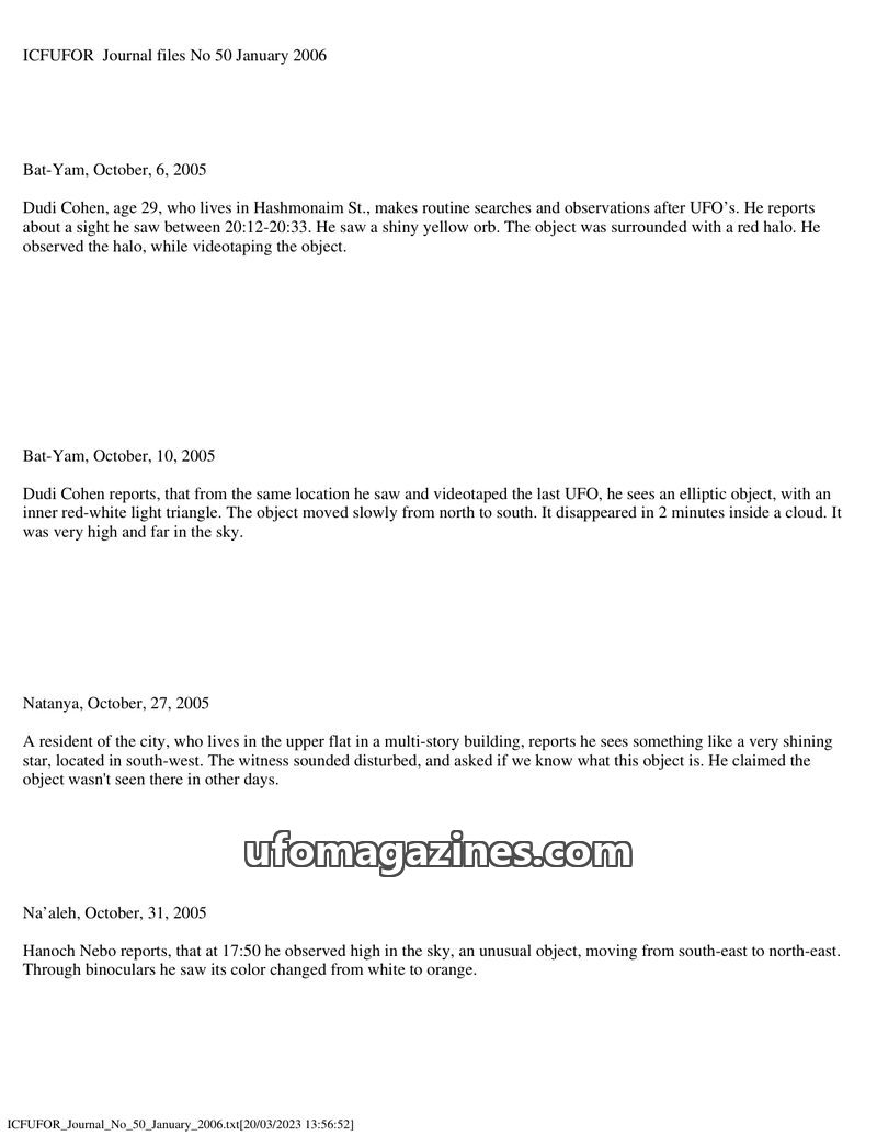 This issue of ICFUFOR Journal features several witness reports of unidentified aerial phenomena in Israel during late 2004 and early 2005. Sightings include objects described as se
