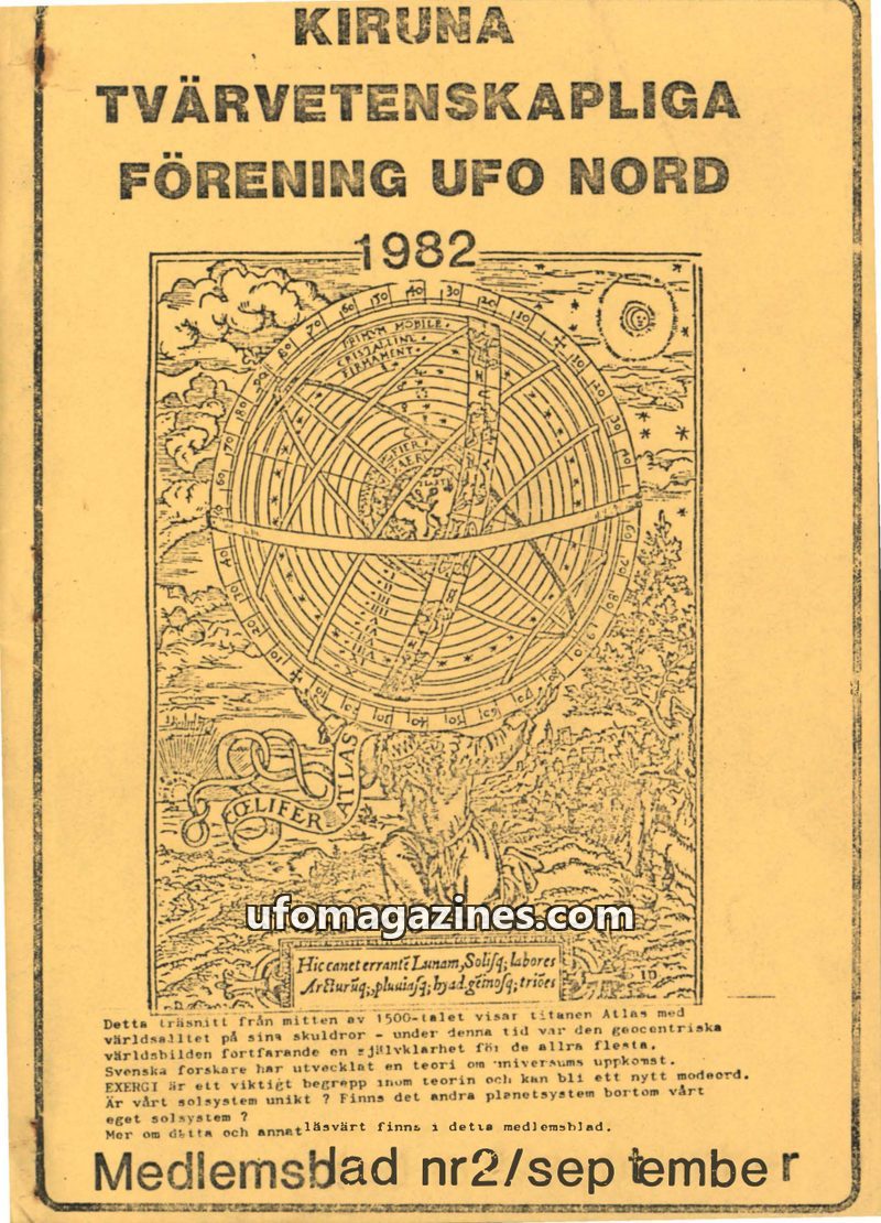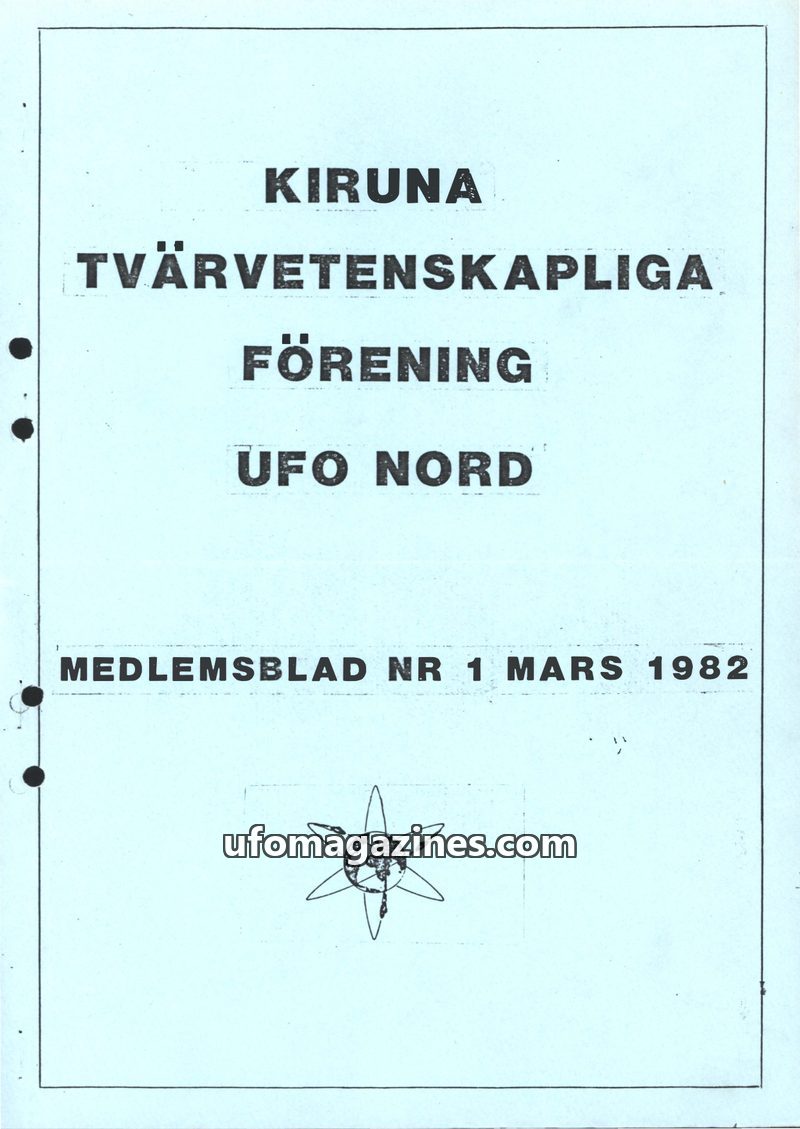 This is the first member's magazine from the Kiruna Tvärvetenskapliga Förening UFO Nord, published in March 1982. It aims to inform members who cannot attend meetings and covers to