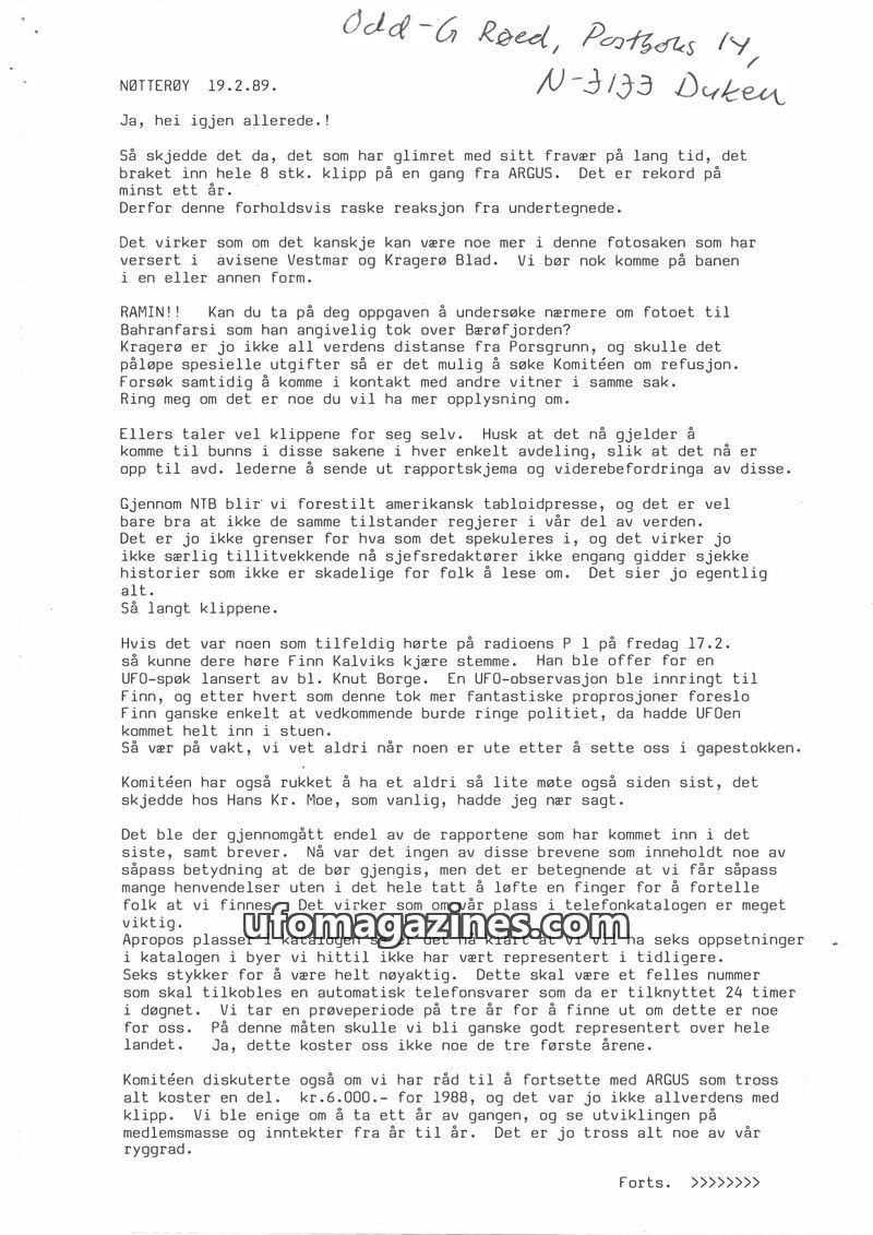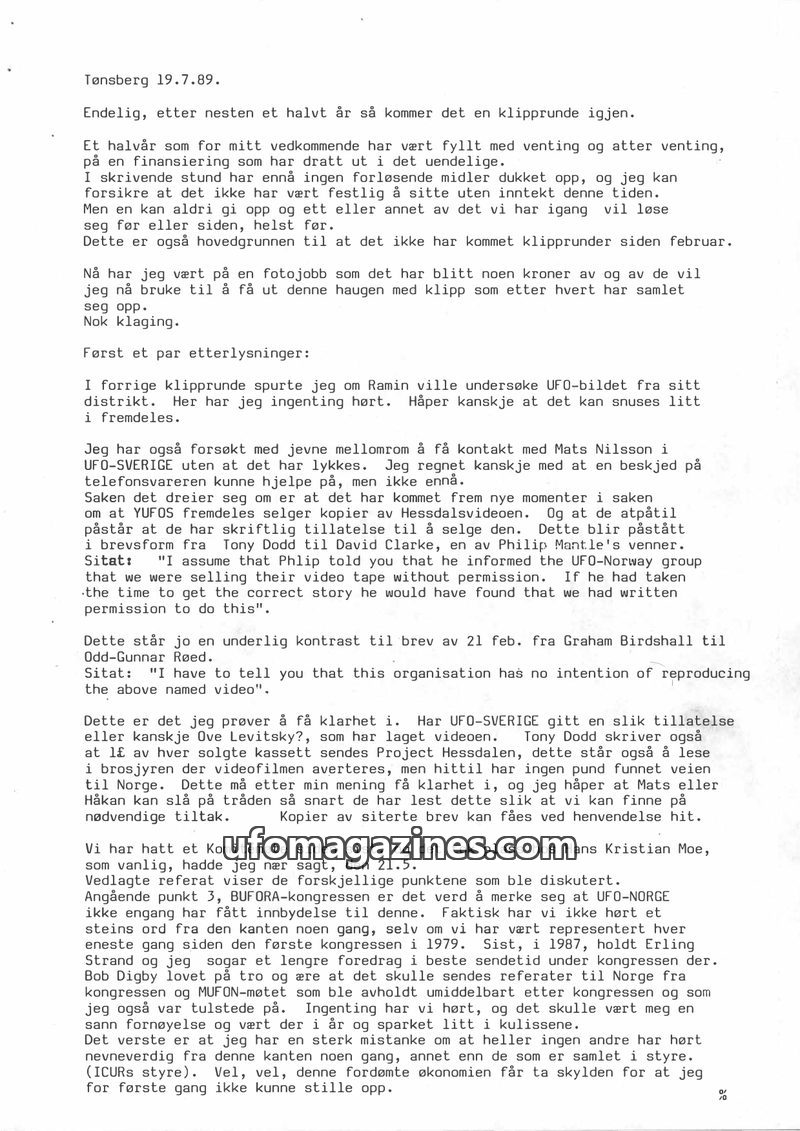 This issue of UFO-Kontakt magazine, dated July 19, 1989, delves into various UFO sightings and related phenomena across Norway. It discusses alleged unauthorized sales of the Hessd