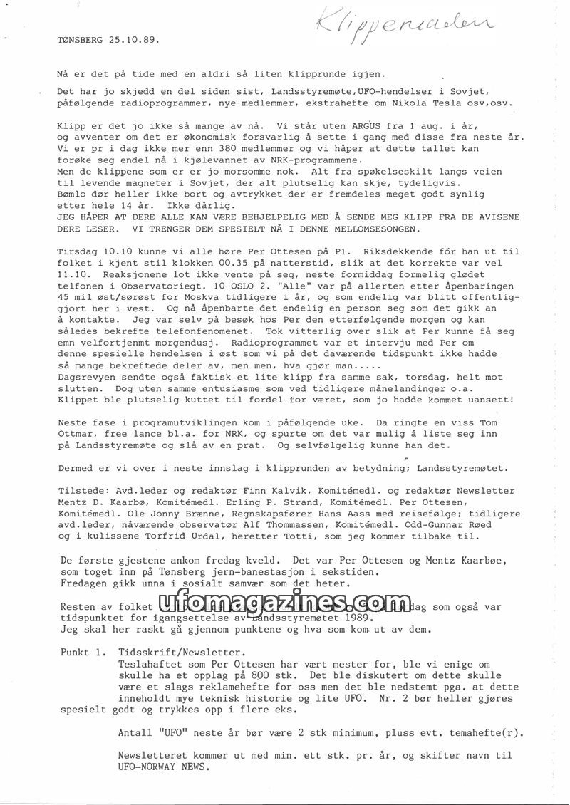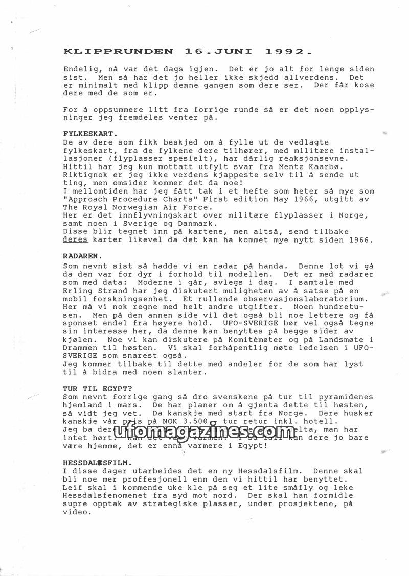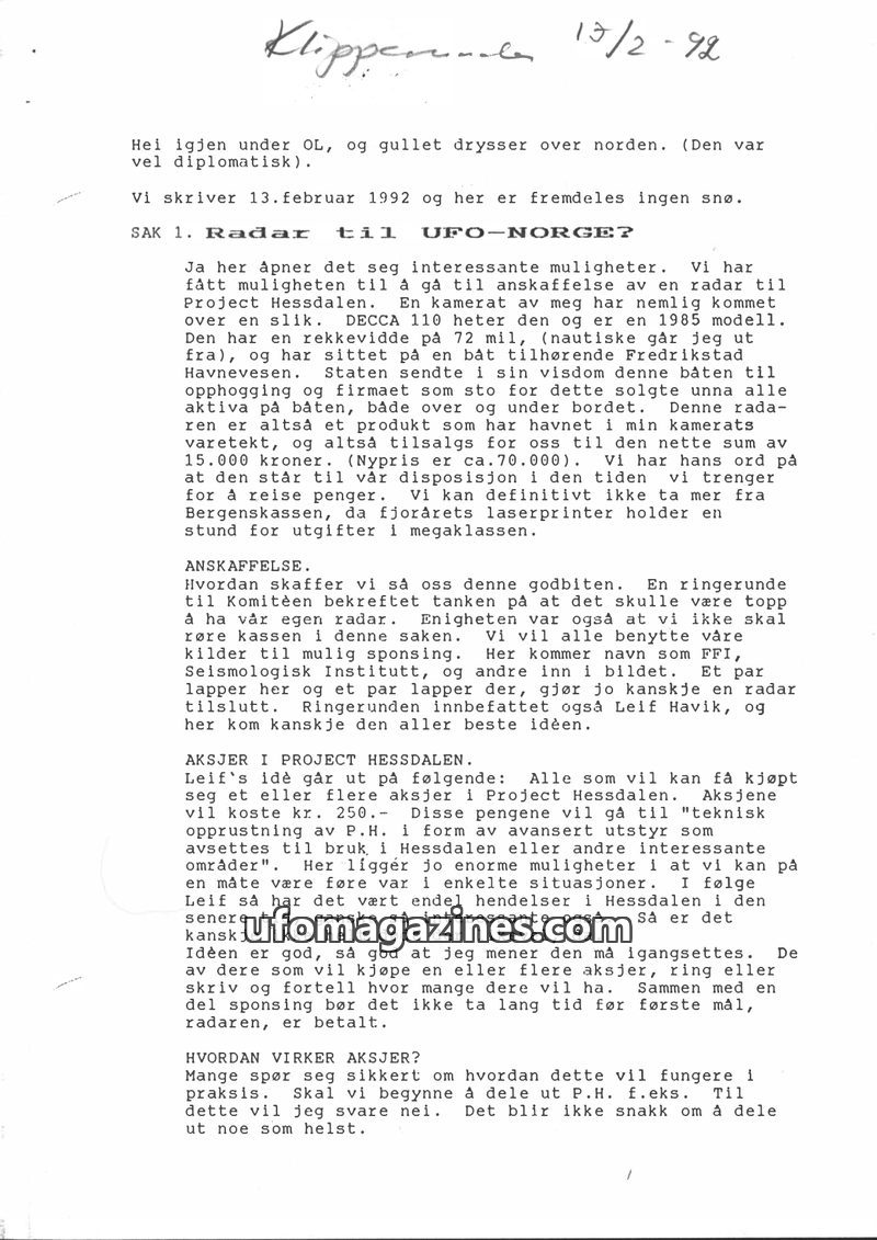 This issue of Klipp focuses on UFO-related activities in Norway. A key development is the potential acquisition of a DECCA 110 radar for Project Hessdalen, funded through a share s
