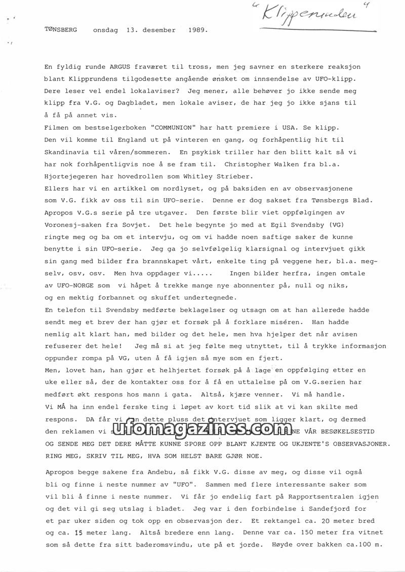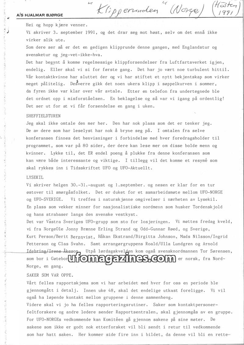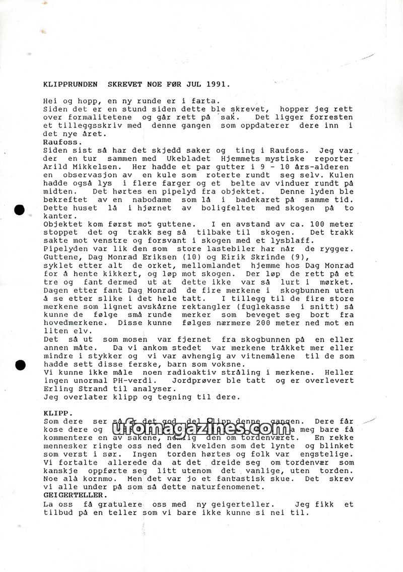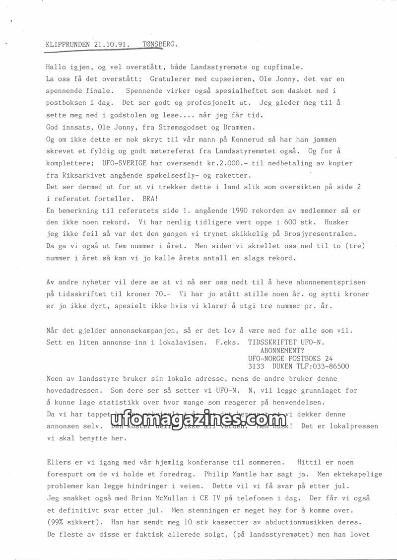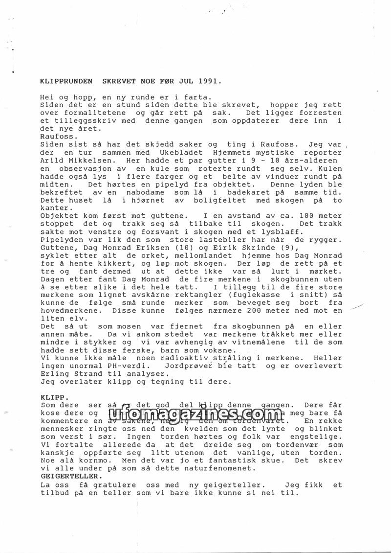 This issue of Klipprunden from late 1991 and early 1992 covers a range of topics including UFO sightings in Norway, particularly in the Arendal and Froland regions, with detailed w