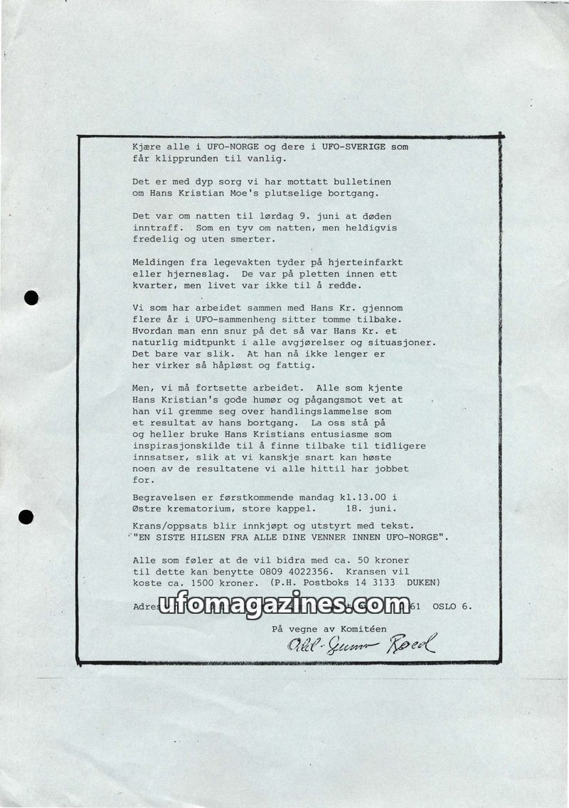 This bulletin from UFO-NORGE announces the sudden death of Hans Kristian Moe, a significant member, on the night of Saturday, June 9th. The cause is suspected to be a heart attack