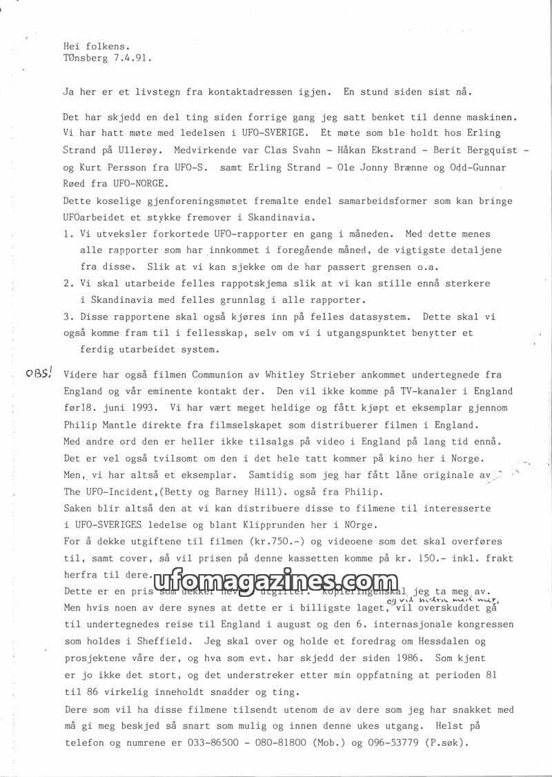 This issue details a meeting between UFO-SVERIGE and UFO-NORGE to establish collaborative UFO reporting and data systems. It announces the availability of the film 'Communion' and